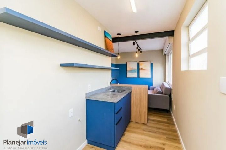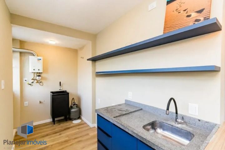 O living é iluminado e versátil, perfeito para estar e receber amigos. A cozinha integrada é prática, com pia, balcão e prateleiras. O dormitório é reservado e conta com armário. O banheiro possui box de vidro e armário, e a área de serviço integrada inclui tanque e junker.