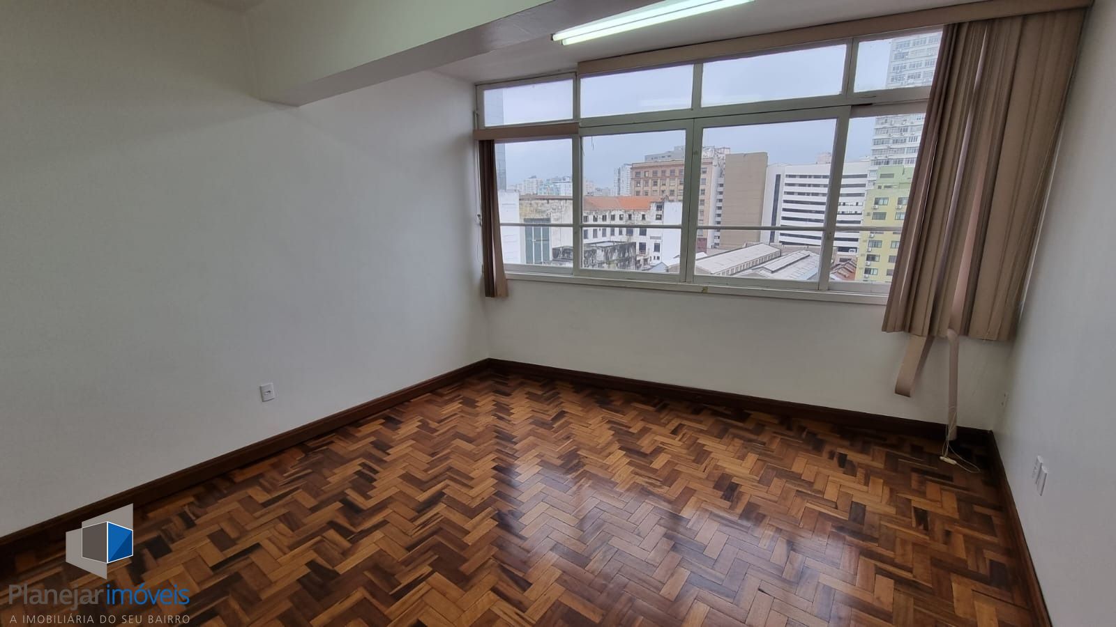 PLANEJAR IMÓVEIS ALUGA: Ótima sala comercial no Centro de Porto Alegre. Conjunto de 2 salas unificadas, com divisórias para 3 salas, com copa e 2 lavabos. Bem iluminada, piso em parquet em ótimo estado.