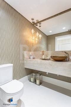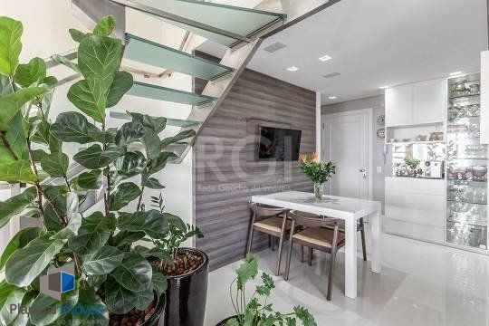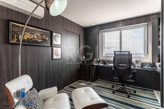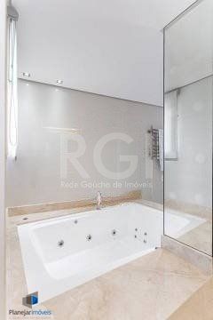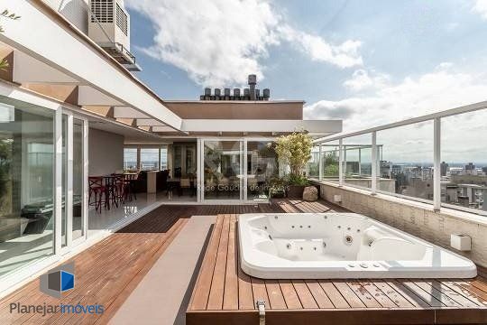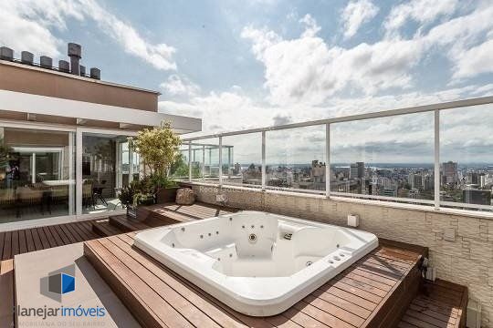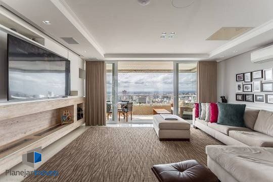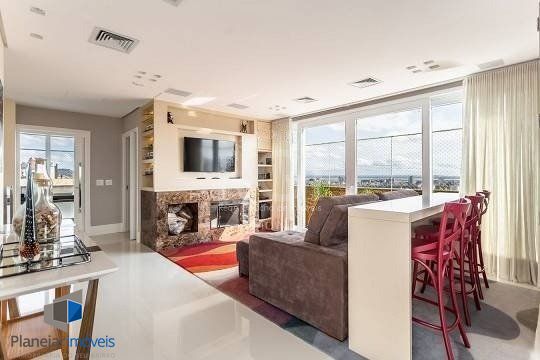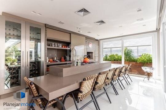 No pavimento superior estão mais 2 suítes, cozinha completa, estar com lareira e janta, ótimo espaço gourmet com adega, bancada com churrasqueira que fica interligado com um belo terraço com jacuzzi. Todos os ambientes possuem climatização, ficam todos os itens eletrônicos e eletrodomésticos. O imóvel conta com 7 vagas de garagem individuais e amplo depósito privativo.