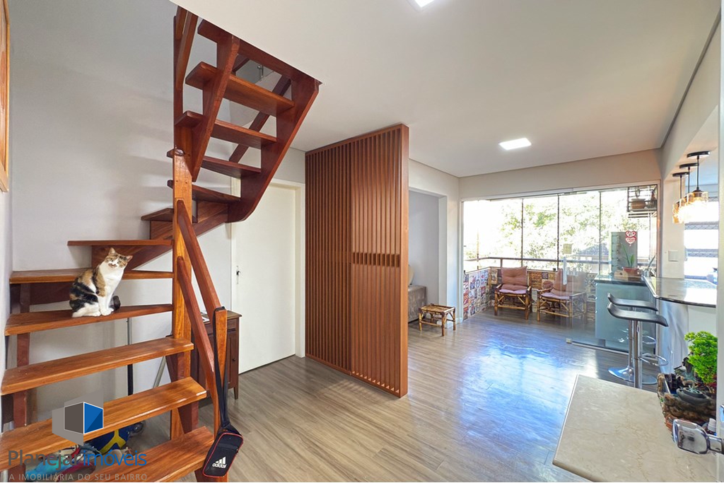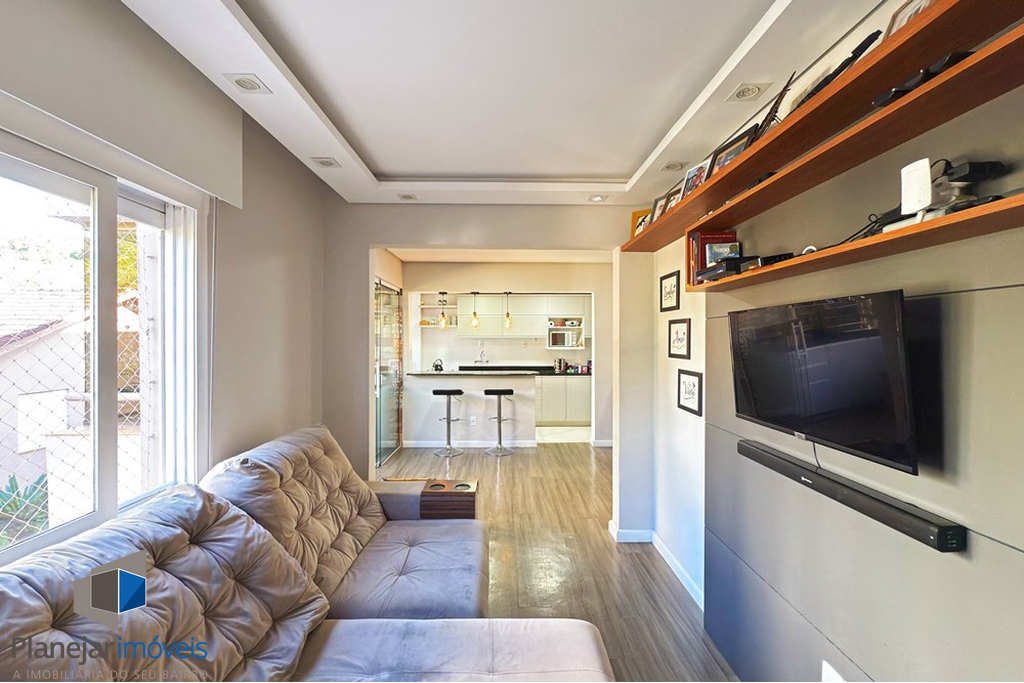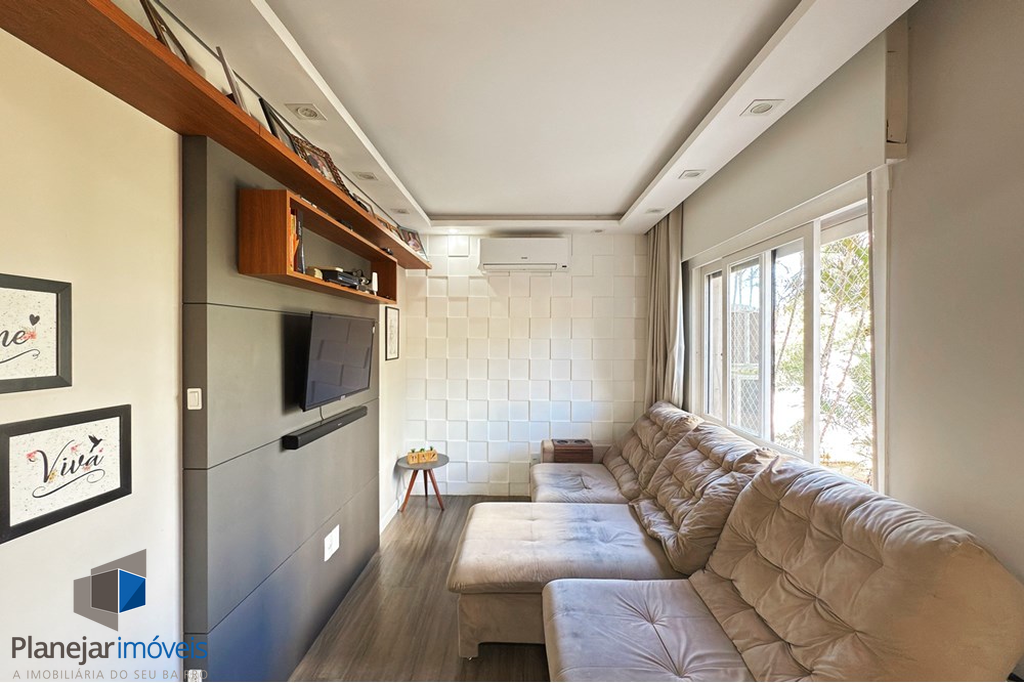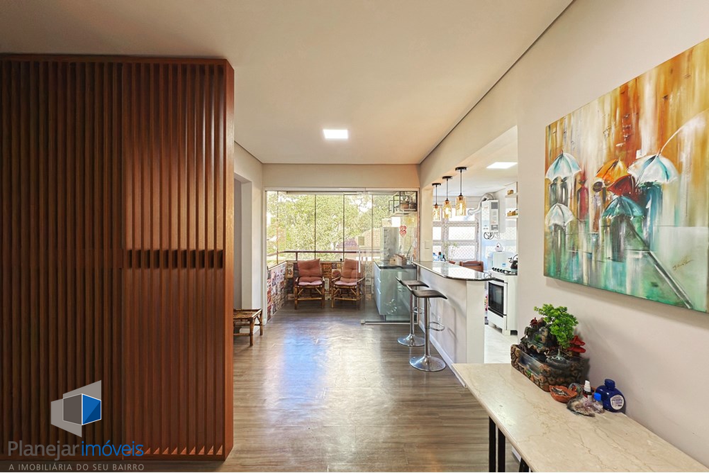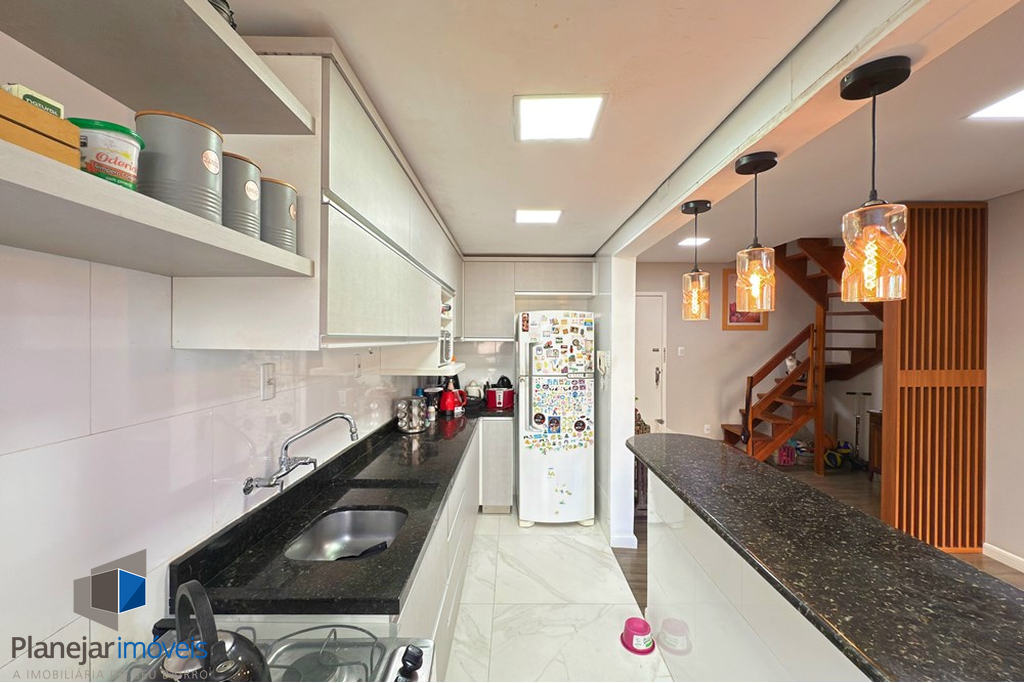 O destaque fica para o amplo living, que integra de forma acolhedora as áreas de estar, jantar e cozinha, criando um ambiente perfeito para reunir amigos e familiares. A cozinha conta com móveis planejados, otimizando o espaço e proporcionando praticidade no dia a dia.