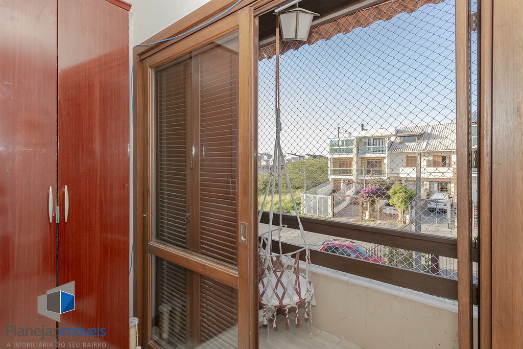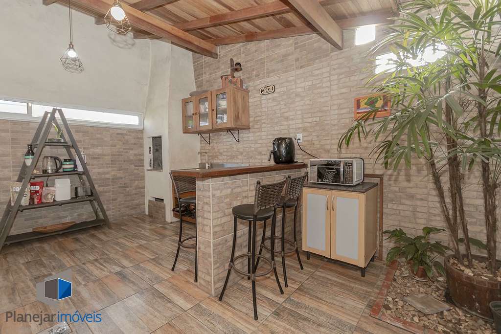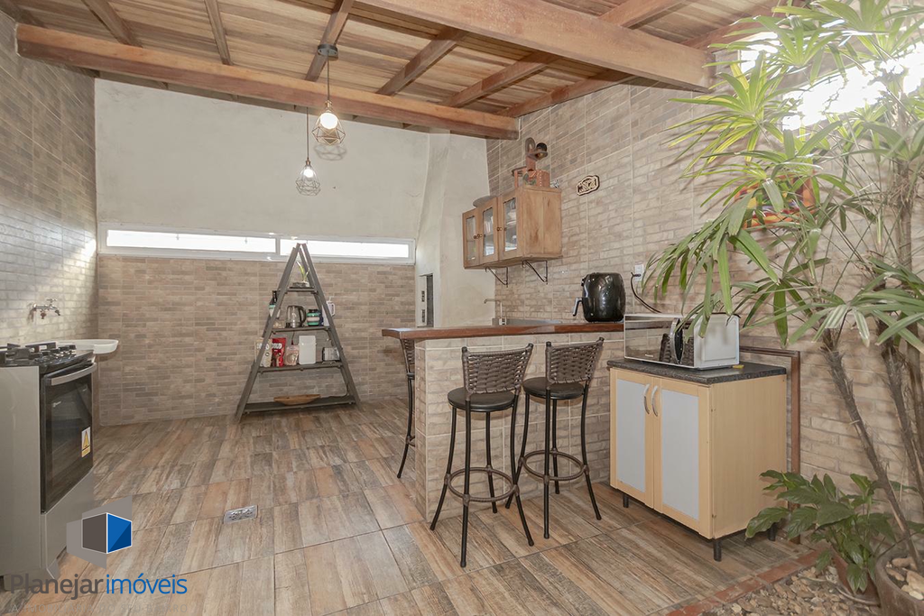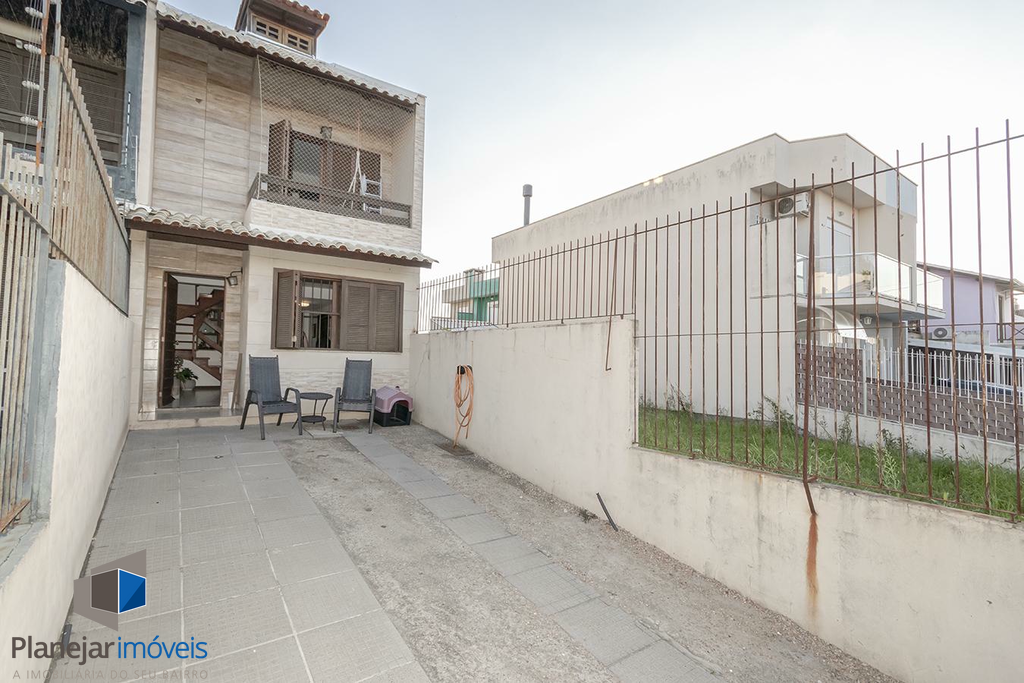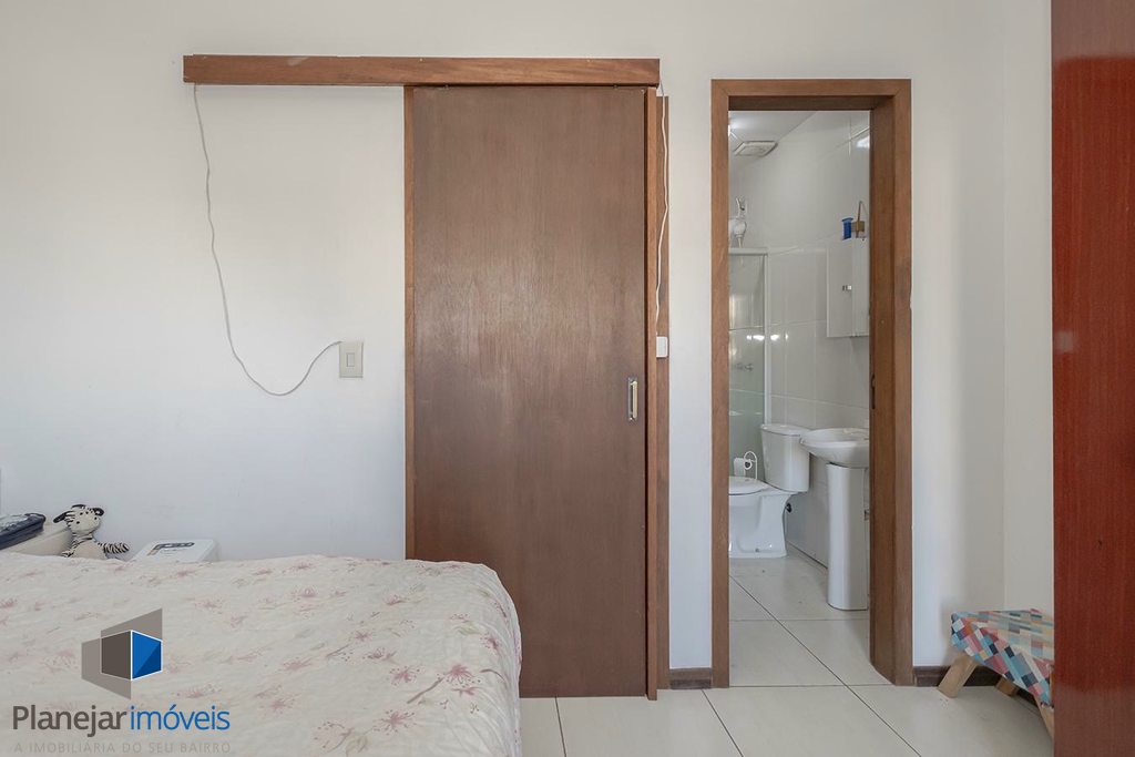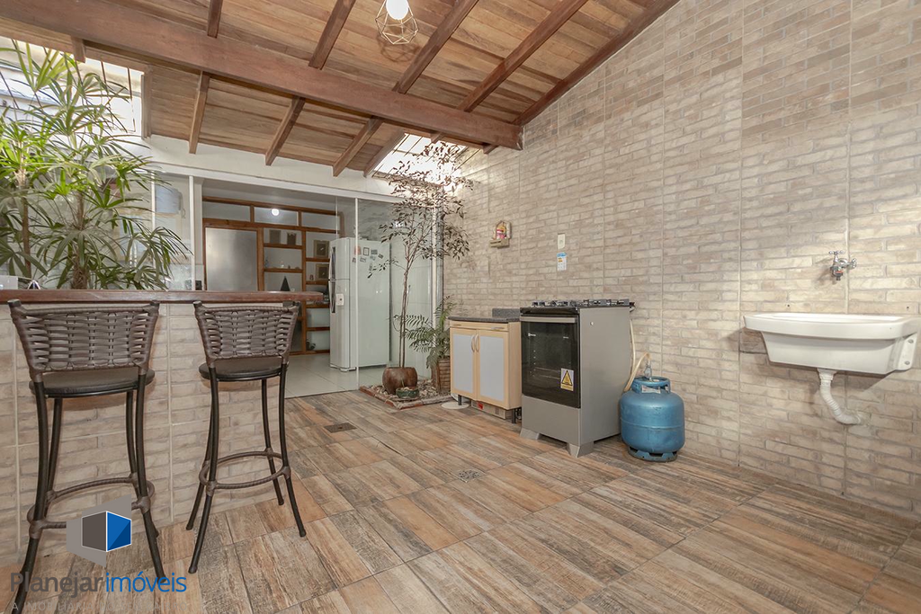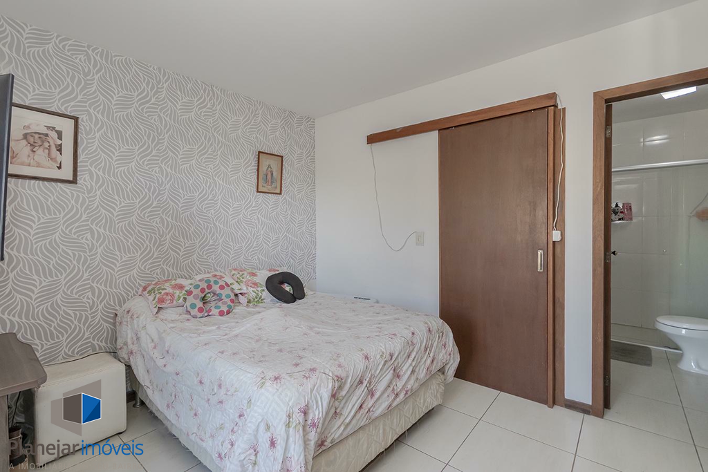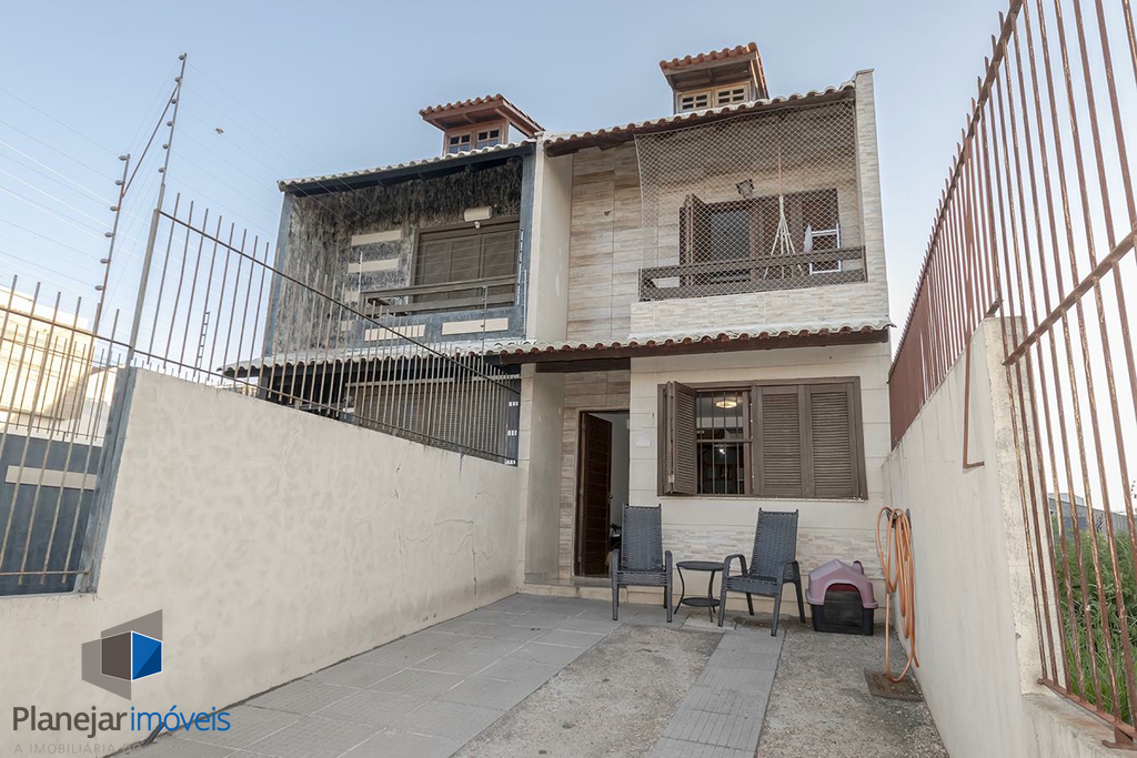 O imóvel possui duas suítes, ambas com sacada, o que garante ótima iluminação e ventilação natural aos dormitórios. No pavimento térreo, o projeto contempla uma ampla sala para dois ambientes, lavabo e uma cozinha com churrasqueira integrada à área de serviço.