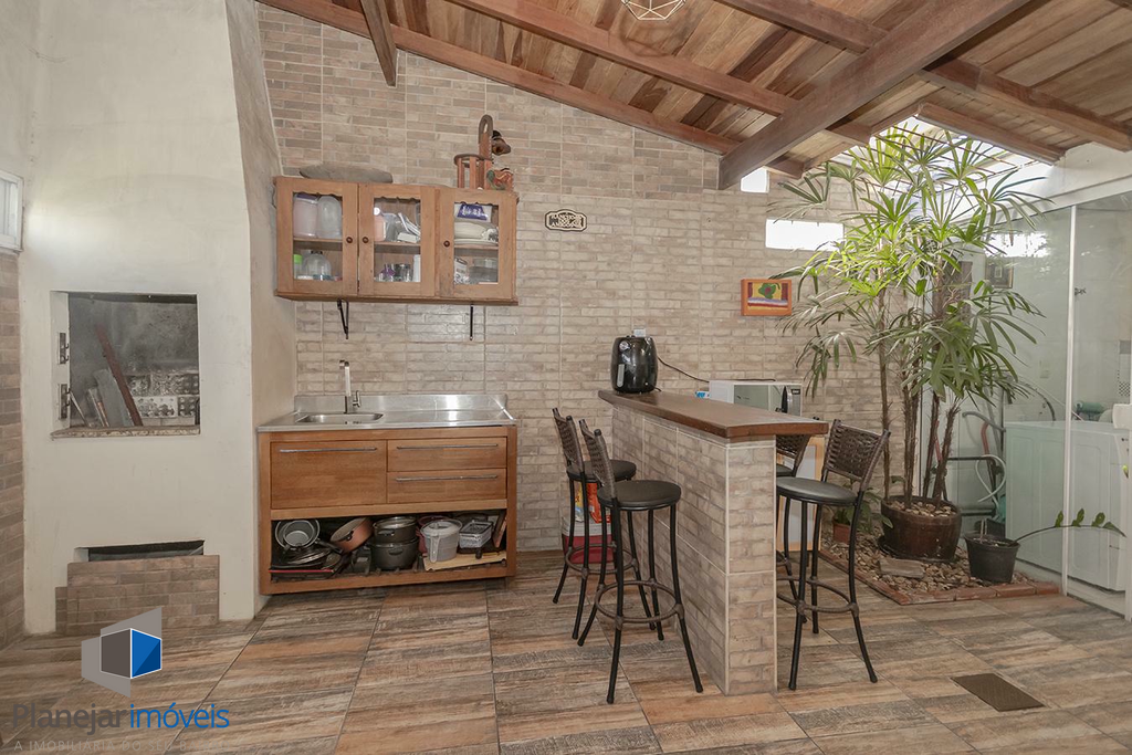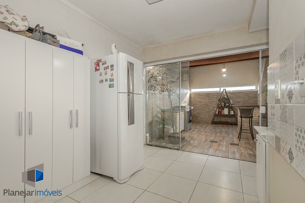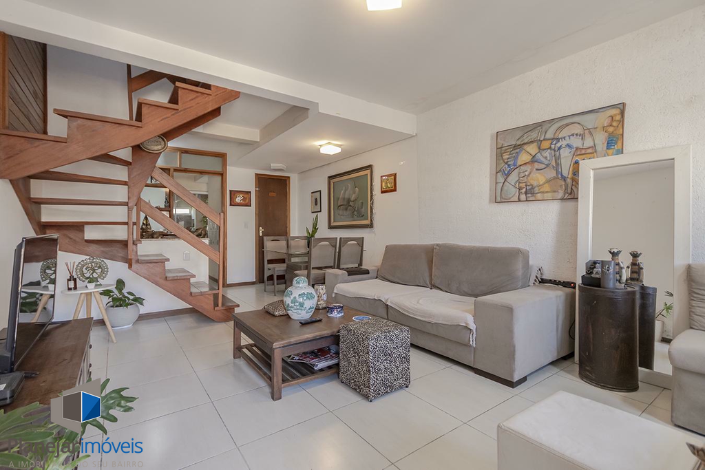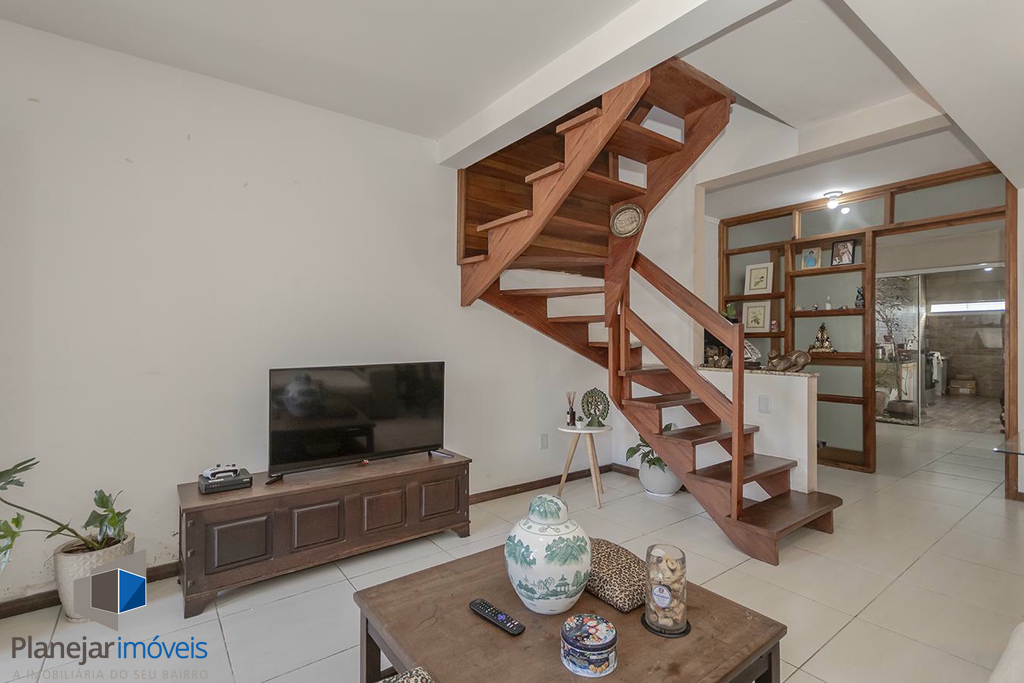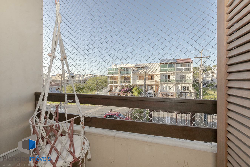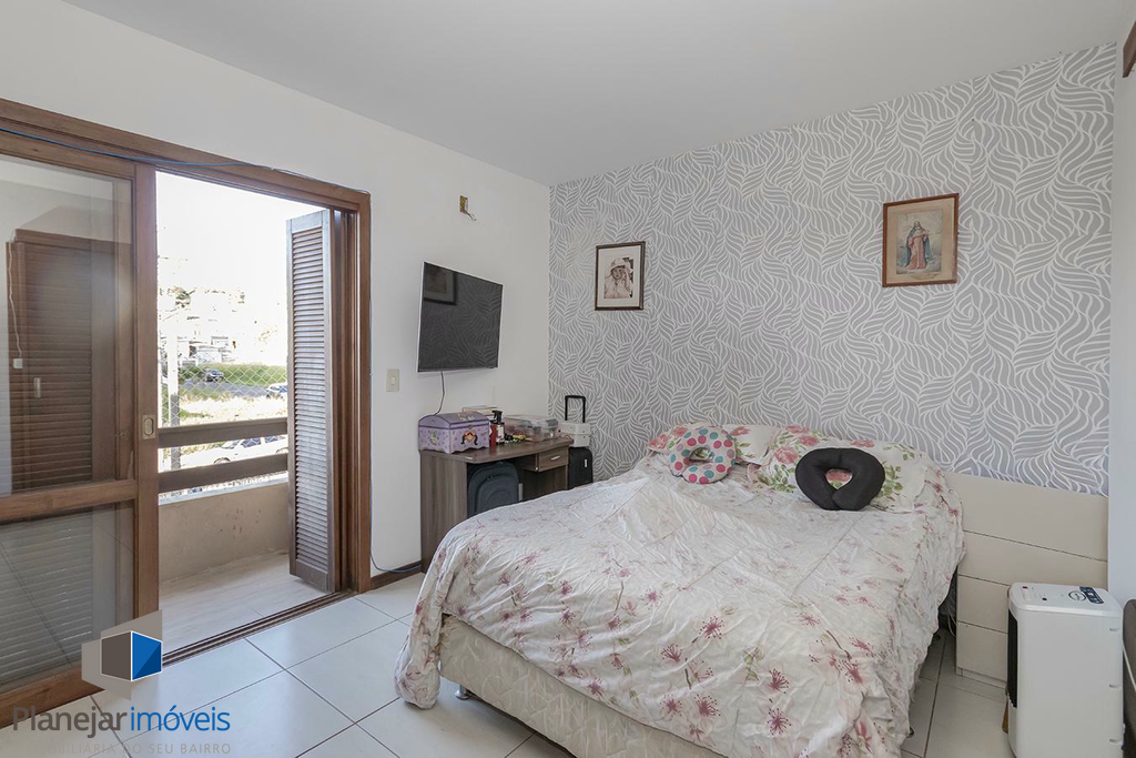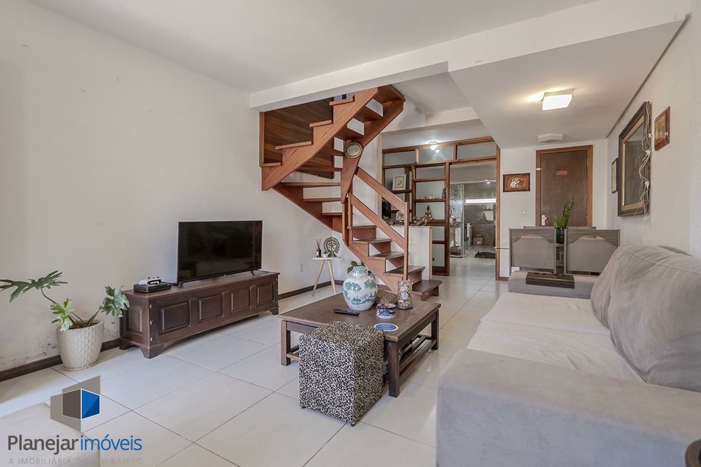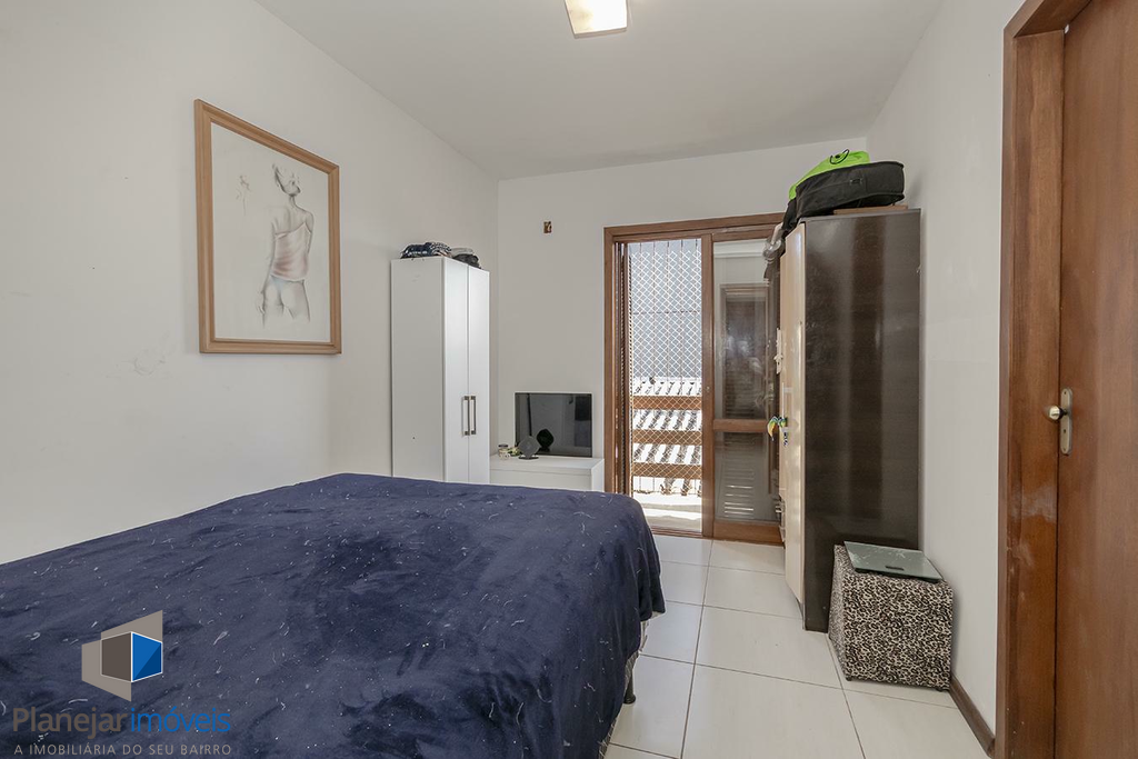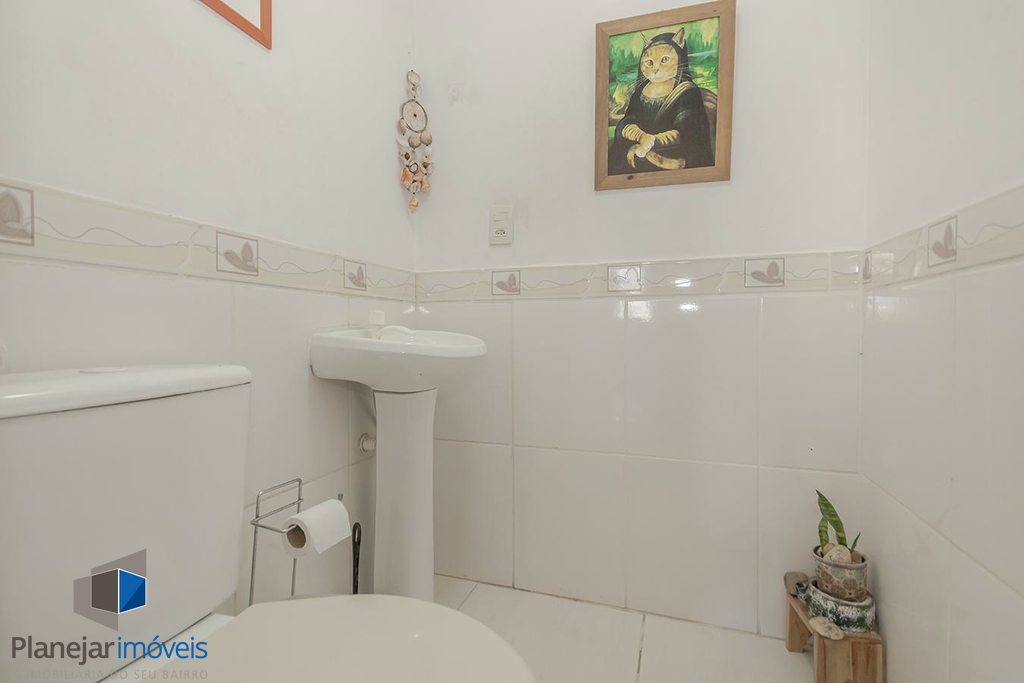 O imóvel possui duas suítes, ambas com sacada, o que garante ótima iluminação e ventilação natural aos dormitórios. No pavimento térreo, o projeto contempla uma ampla sala para dois ambientes, lavabo e uma cozinha com churrasqueira integrada à área de serviço.
