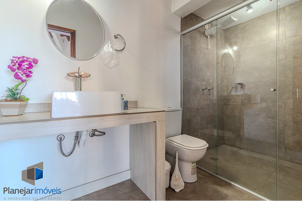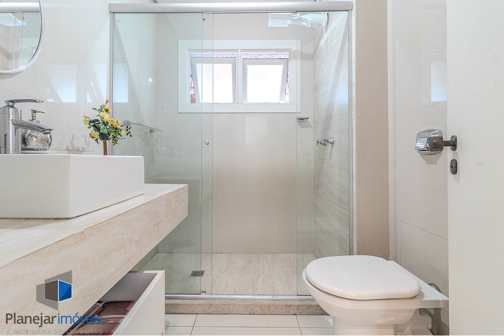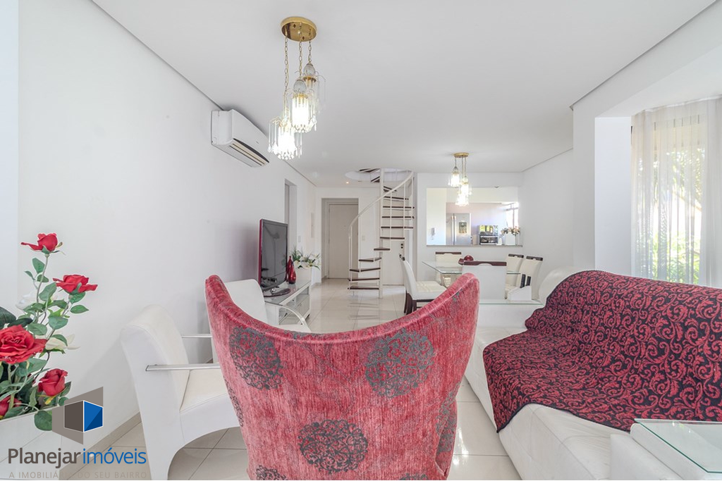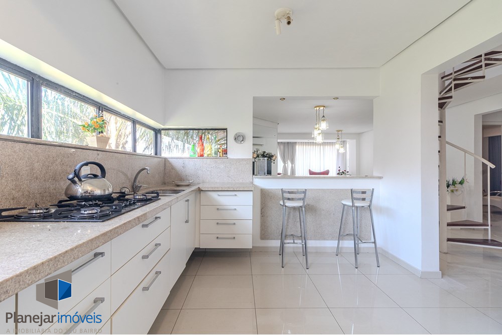 No pavimento inferior, living amplo para três ambientes integra-se à cozinha americana planejada em conceito aberto, contando ainda com lavabo e sistema de gás central. A área íntima dispõe de dois dormitórios bem iluminados e ventilados, atendidos por banheiro social, garantindo funcionalidade e conforto no dia a dia.