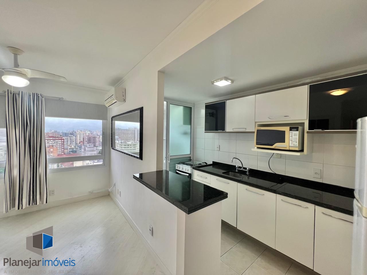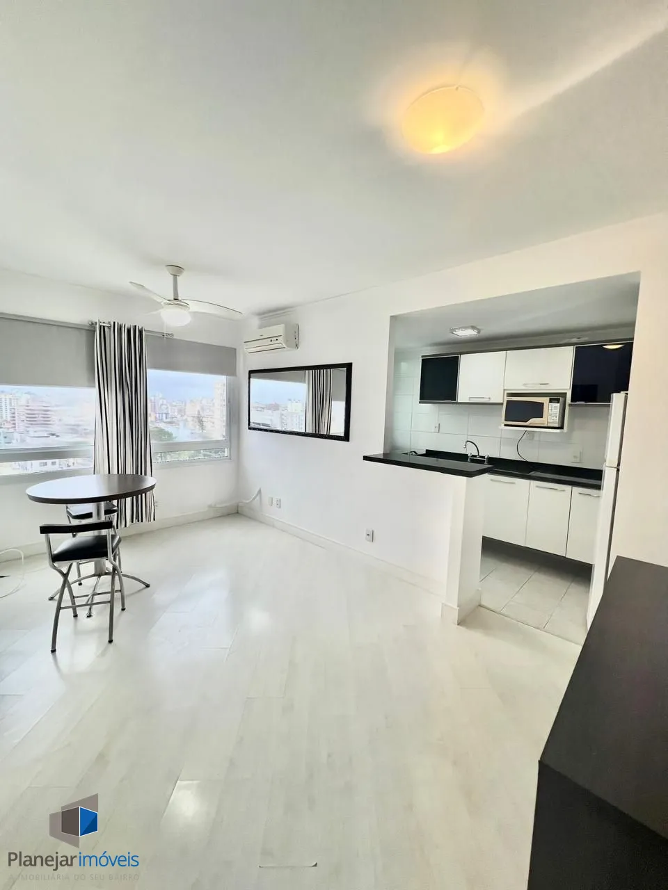 O imóvel possui cozinha americana integrada ao living, proporcionando um ambiente moderno, funcional e perfeito para receber. Conta ainda com banheiro em estilo americano, com acesso prático e inteligente, otimizando o espaço no dia a dia.