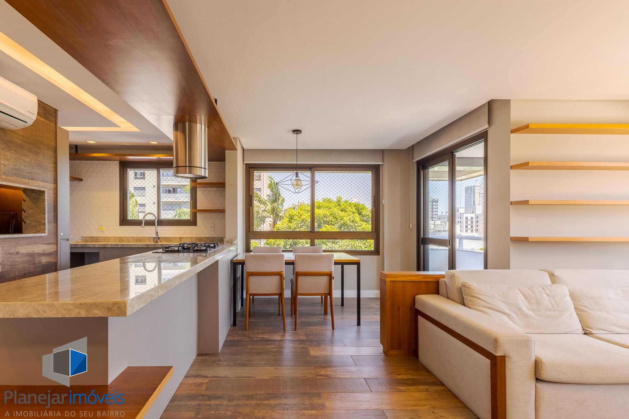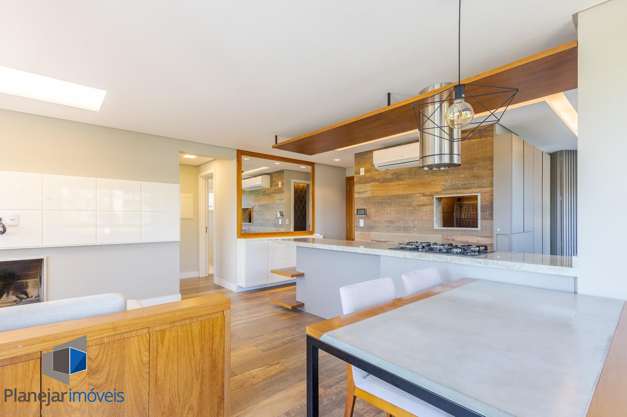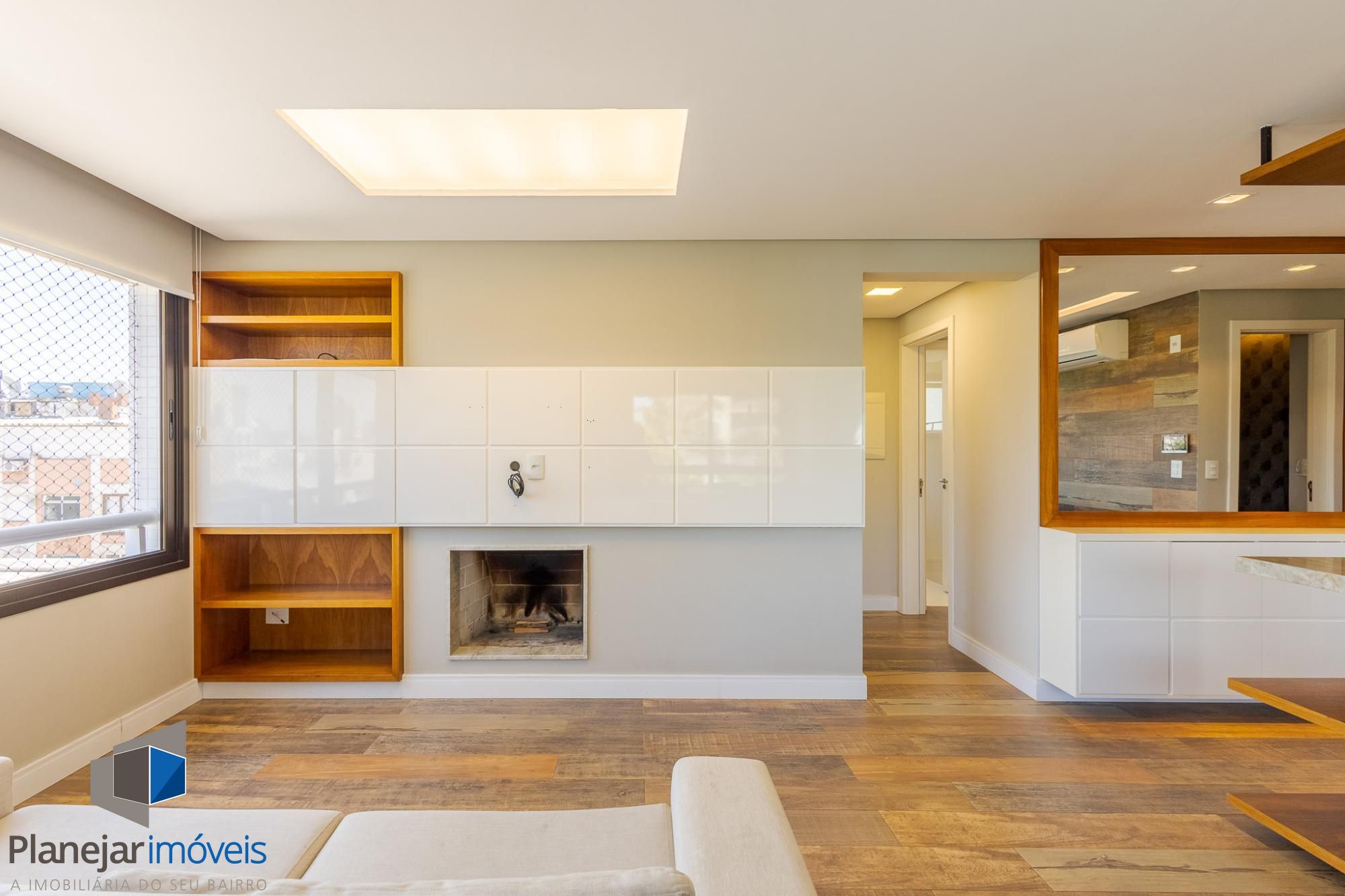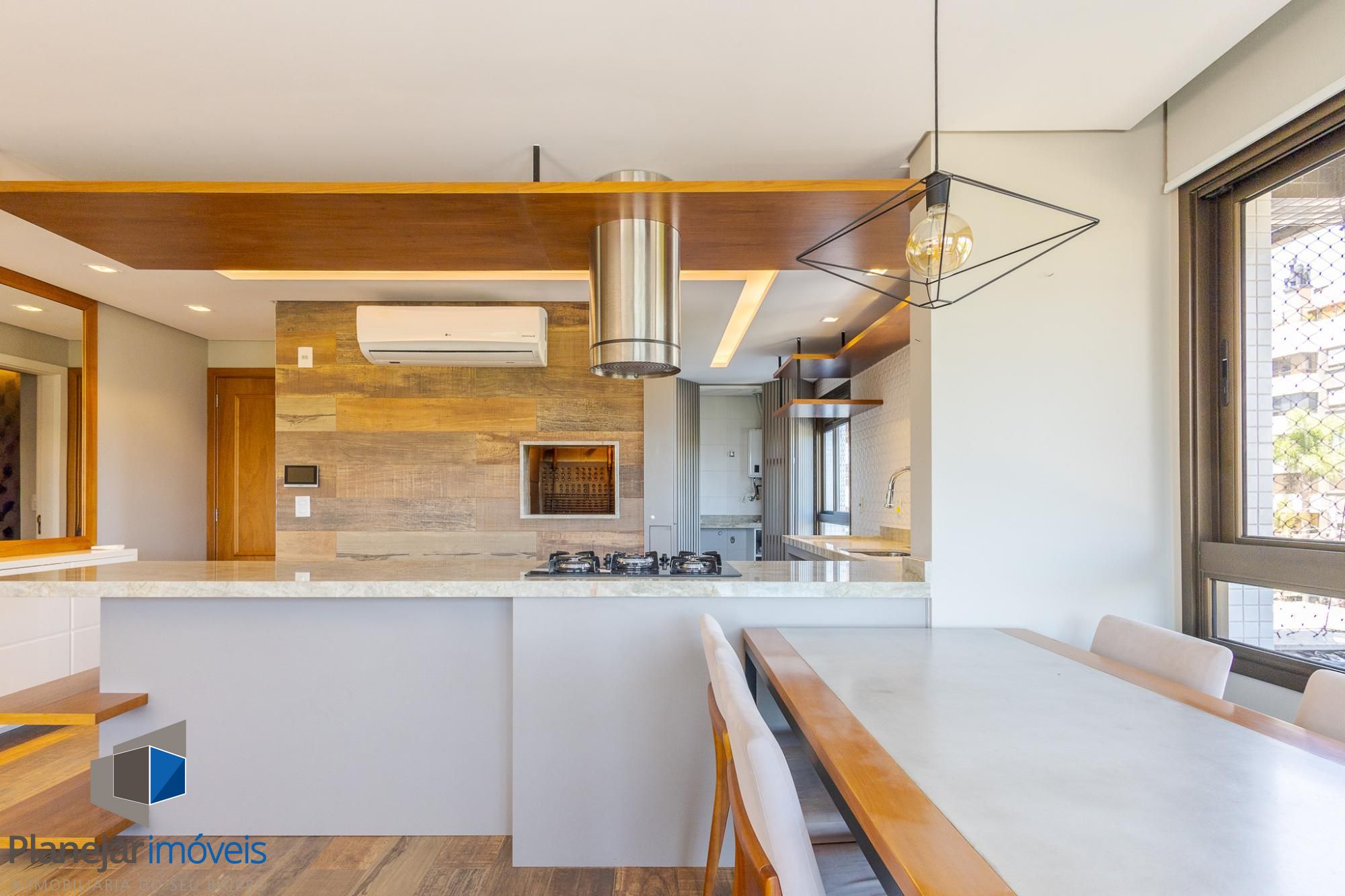 O living amplo para dois ambientes, com lareira e sacada, oferece conforto e ótima entrada de luz natural. A cozinha americana com churrasqueira integra perfeitamente os ambientes, ideal para momentos de convivência, além de contar com lavabo de apoio.