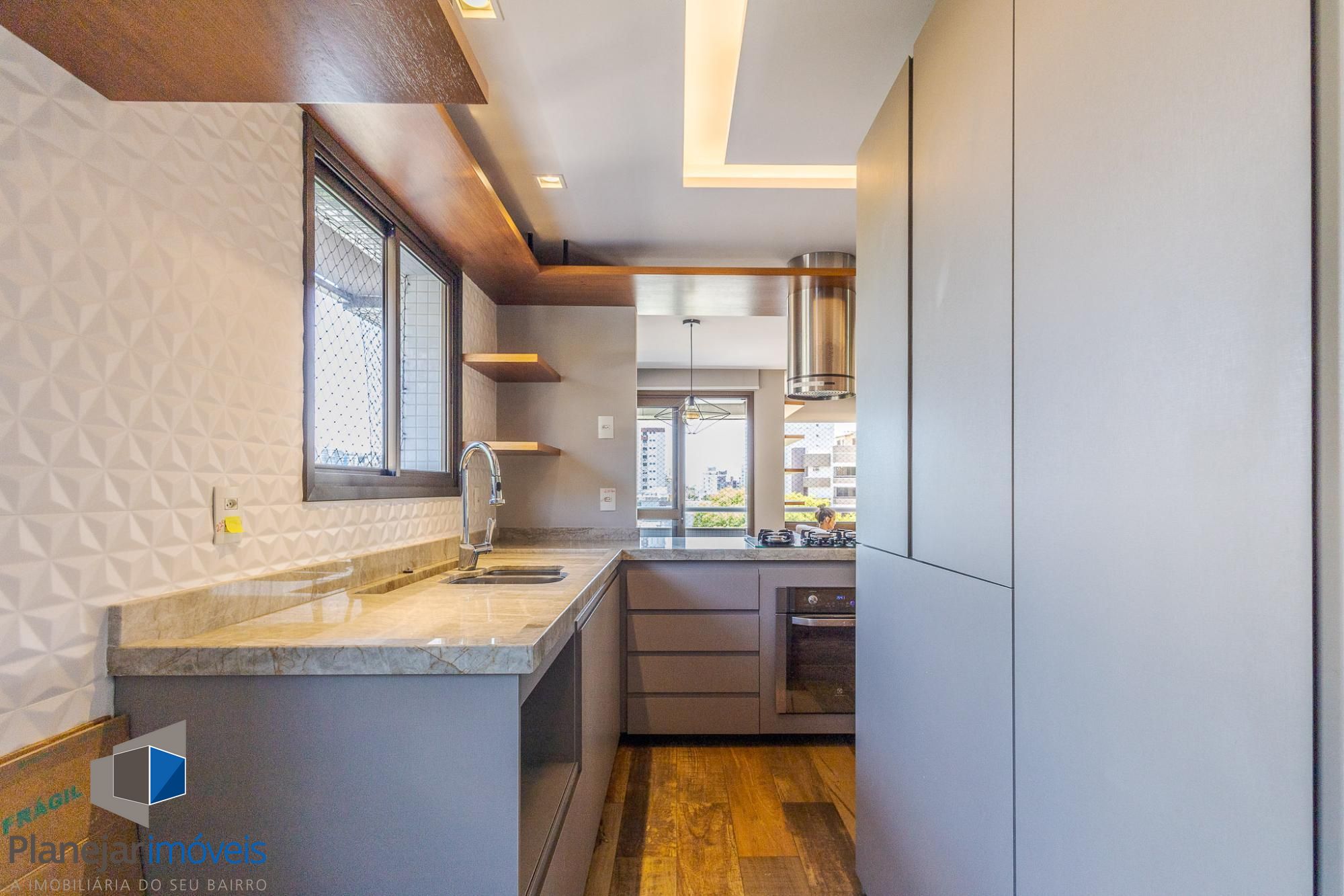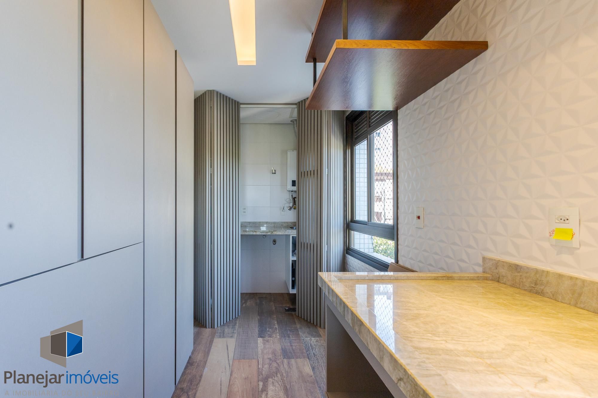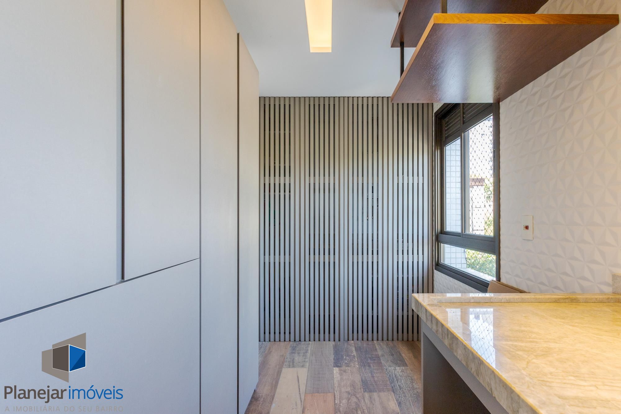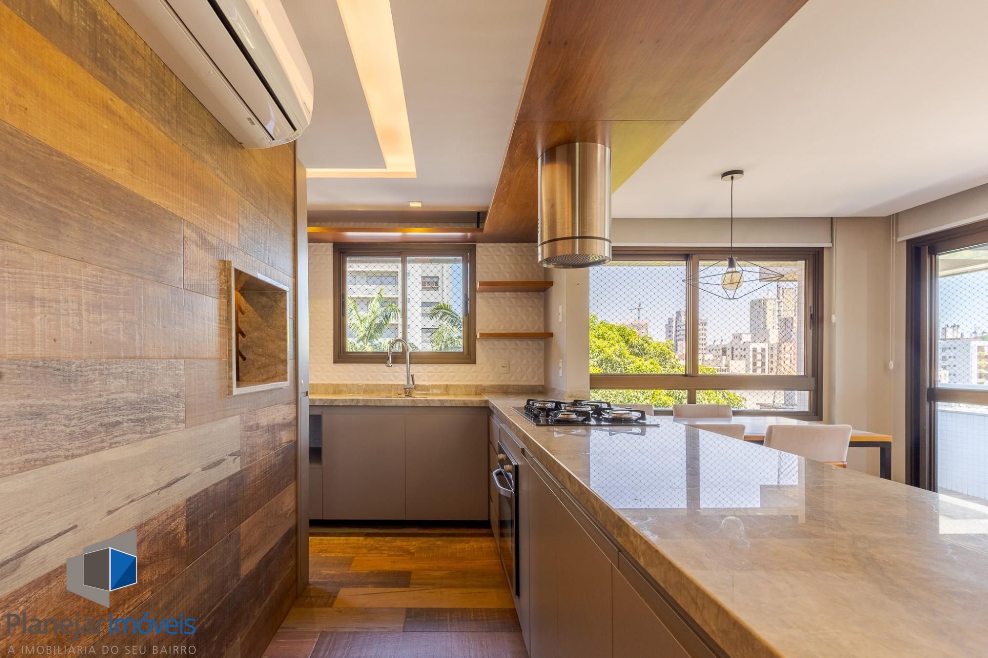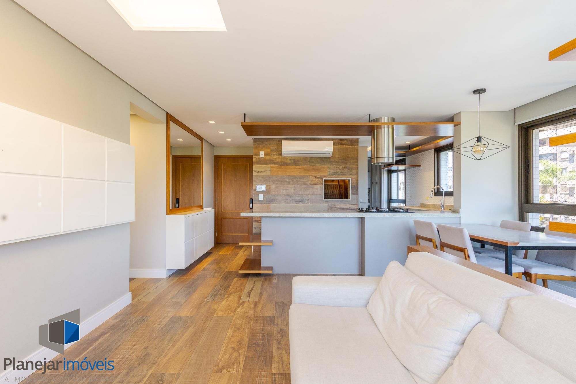 O living amplo para dois ambientes, com lareira e sacada, oferece conforto e ótima entrada de luz natural. A cozinha americana com churrasqueira integra perfeitamente os ambientes, ideal para momentos de convivência, além de contar com lavabo de apoio.