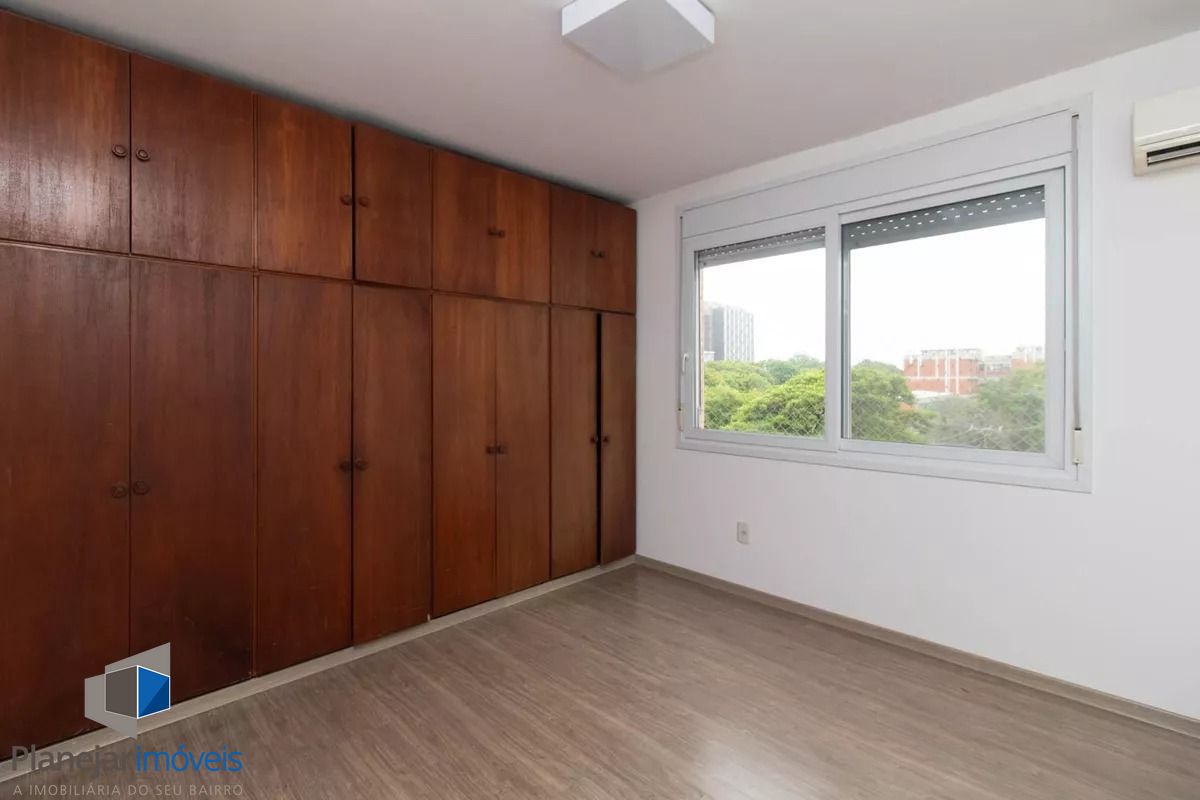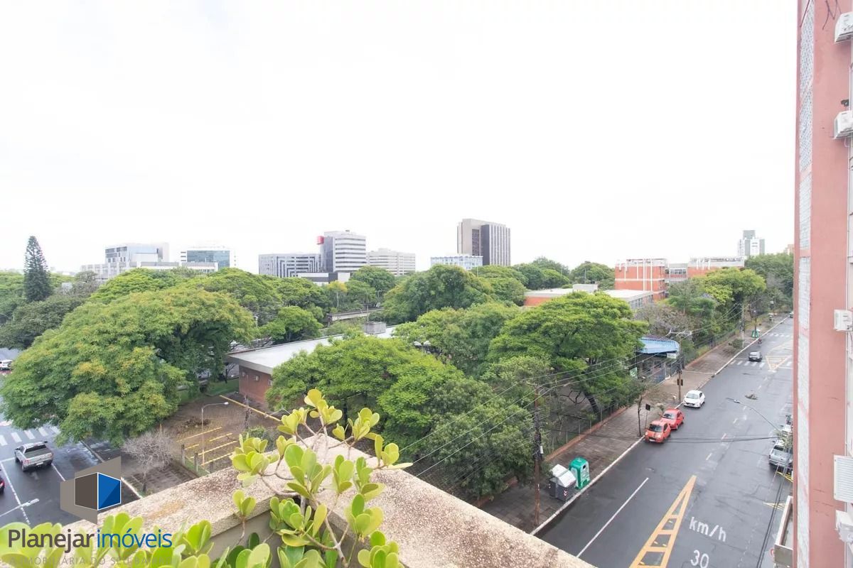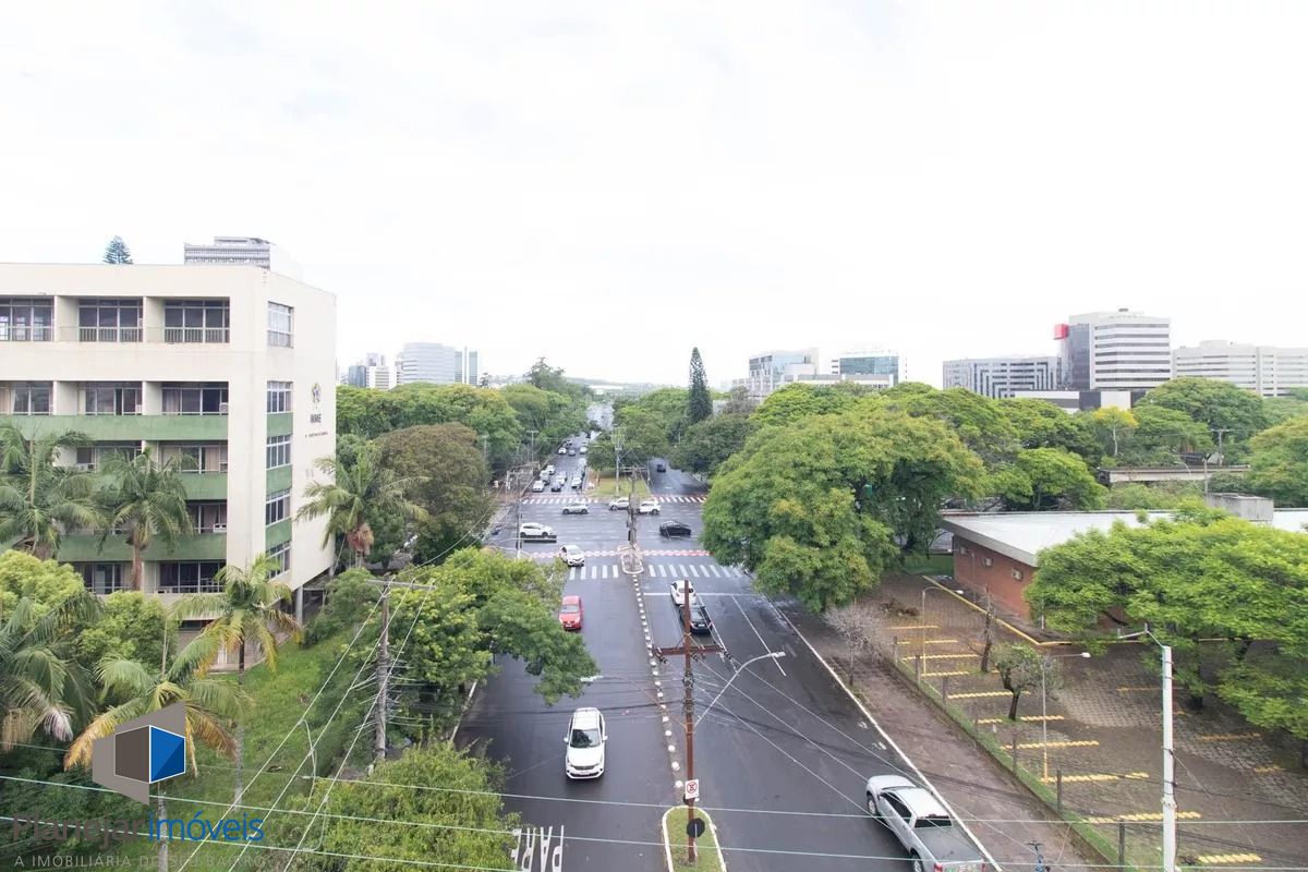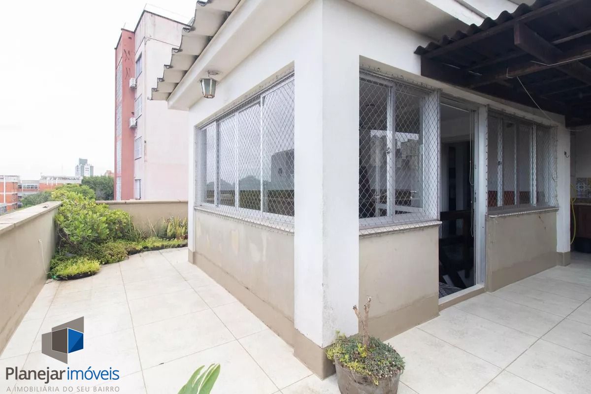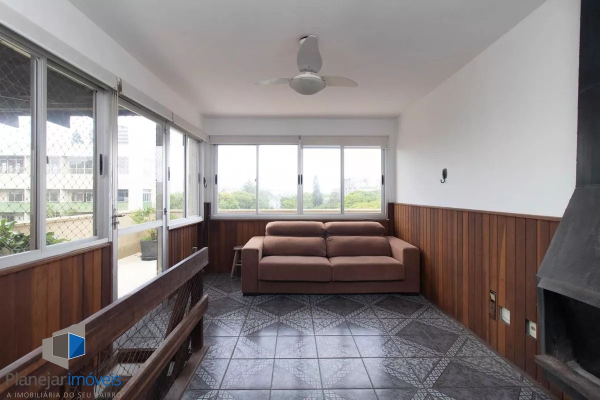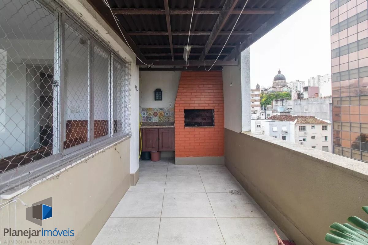 Cobertura de frente para a Washington Luís com uma vista panorâmica (grandioso terraço em formato U), posição solar leste -oeste. 124m2 de área privativa. Parte inferior: sala, cozinha com armários, área de serviço com armário e WC separado, banheiro principal e 02 dormitórios (o maior com armário embutido). Tem ar condicionado em 02 peças e escada reta em madeira para acesso ao segundo piso. Parte superior: salão, banheiro secundário, despensa e terraço com churrasqueira, pia e armário. Há uma vaga de garagem escriturada e coberta. O edifício aceita pets, tem elevador e portão eletrônico, conta com zeladoria e é próximo a supermercado, academia, restaurantes, espaço lazer cultural como o Gasômetro, perto também da faculdade de direito da UFRGS e Parque Farroupilha.
