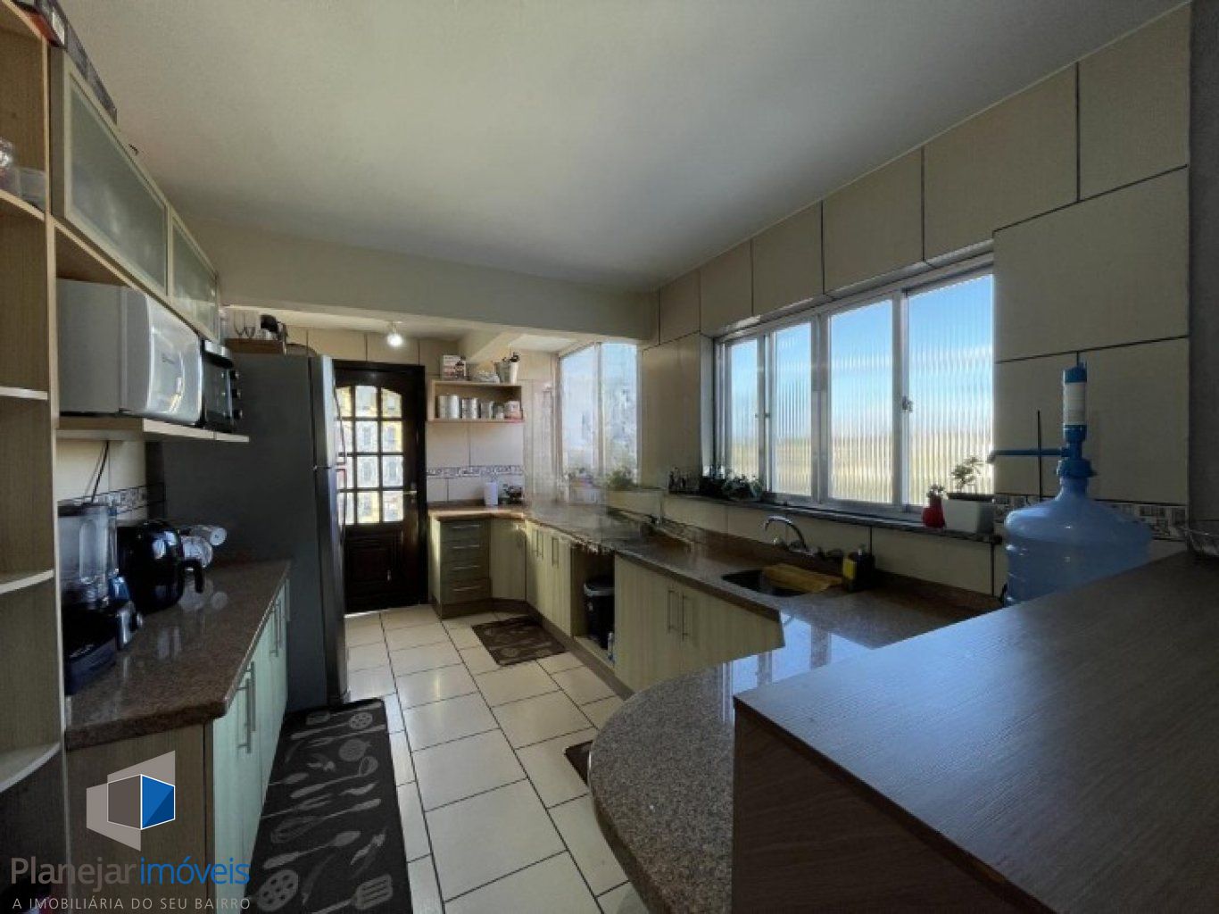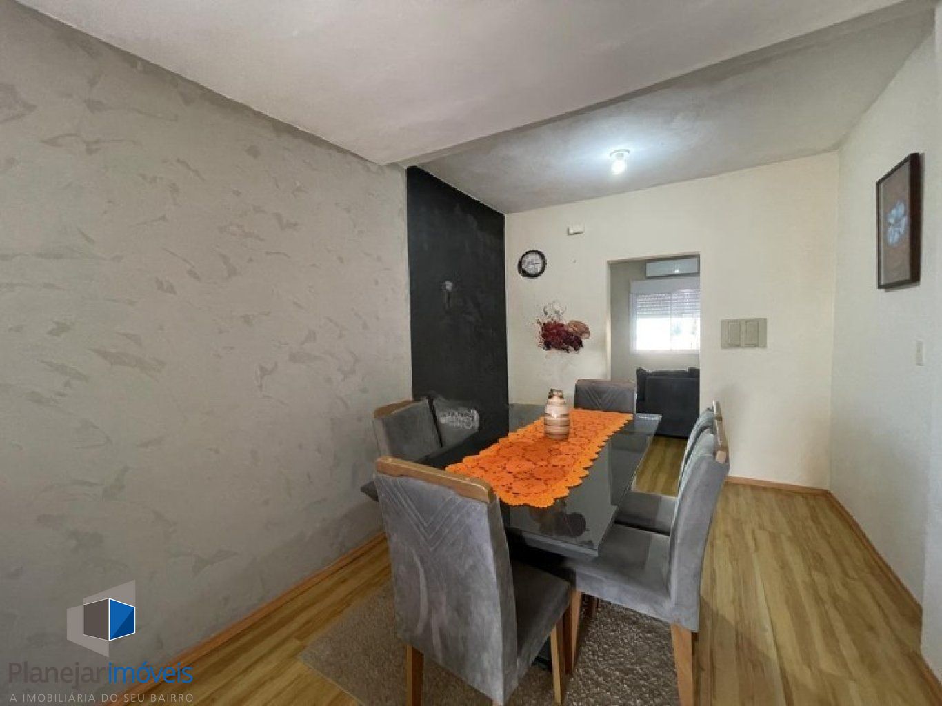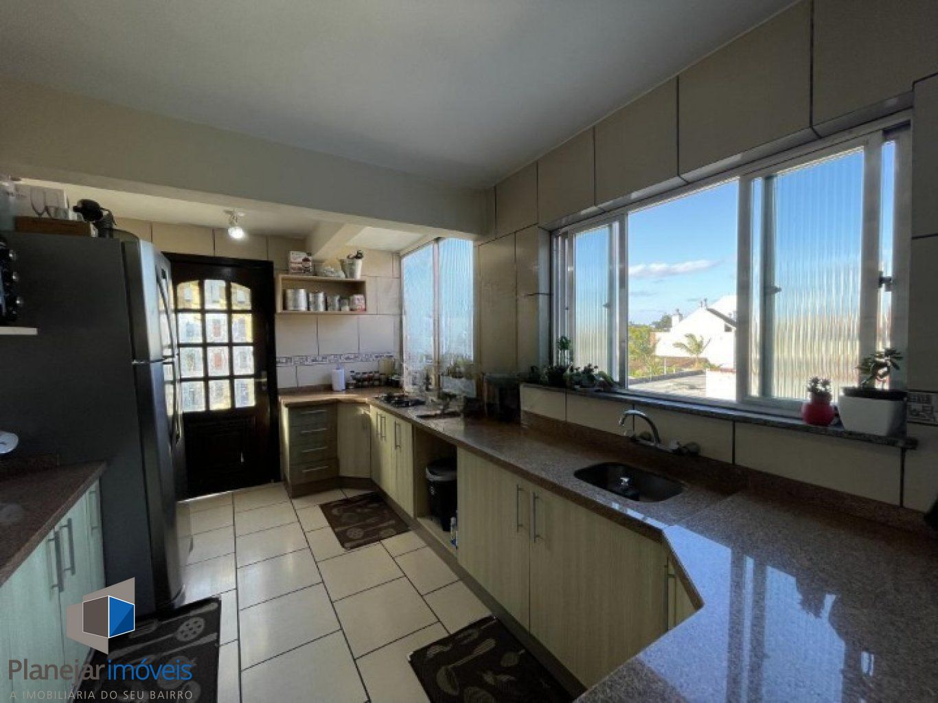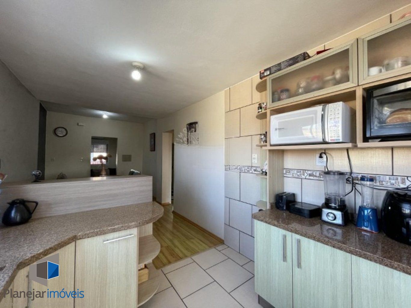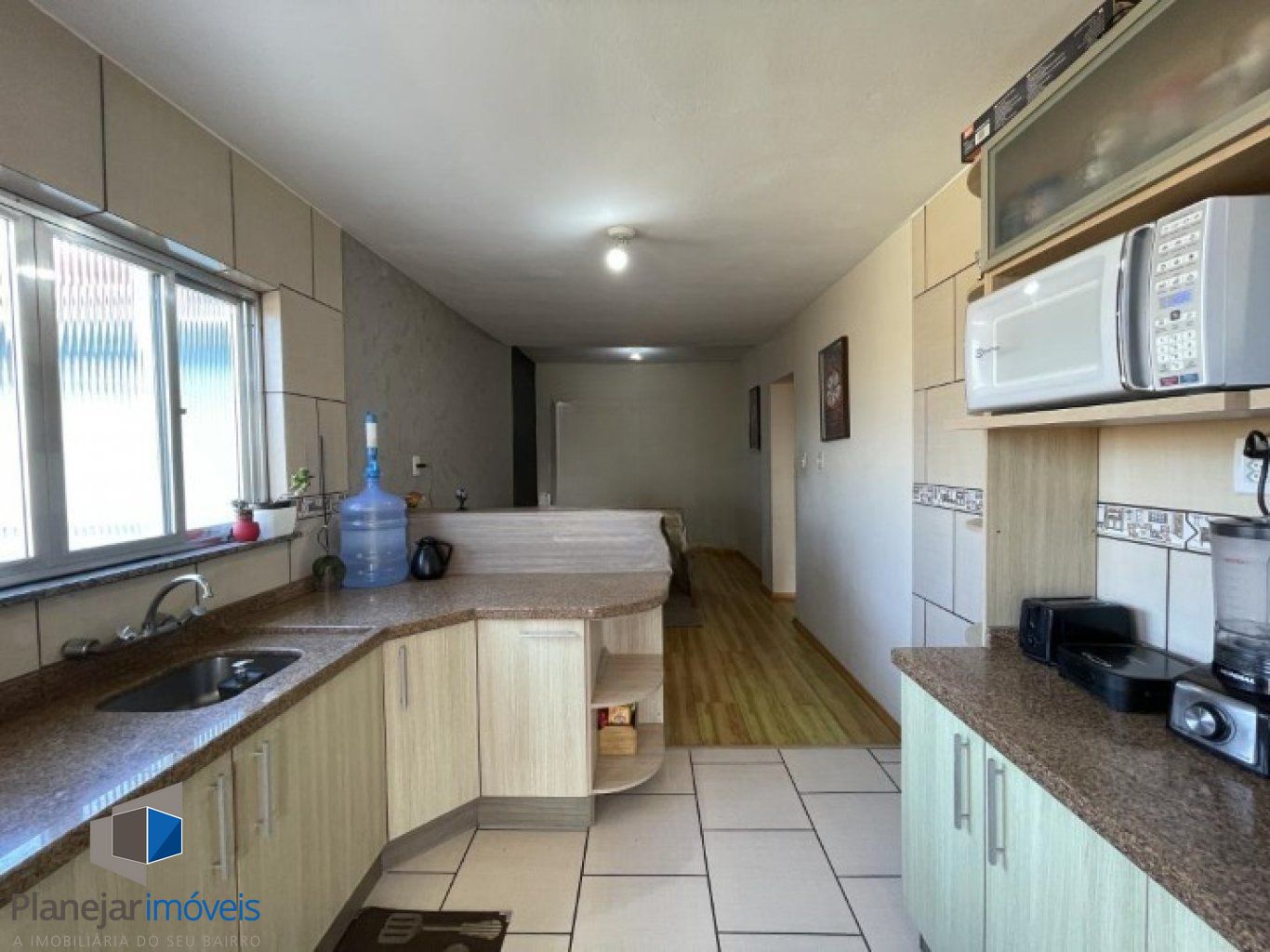 Casa geminada com sala ampla, janelas grandes, ventilada e iluminada, piso laminado. Cozinha gourmet arejada, com boa luz solar, piso cerâmico e janelas.