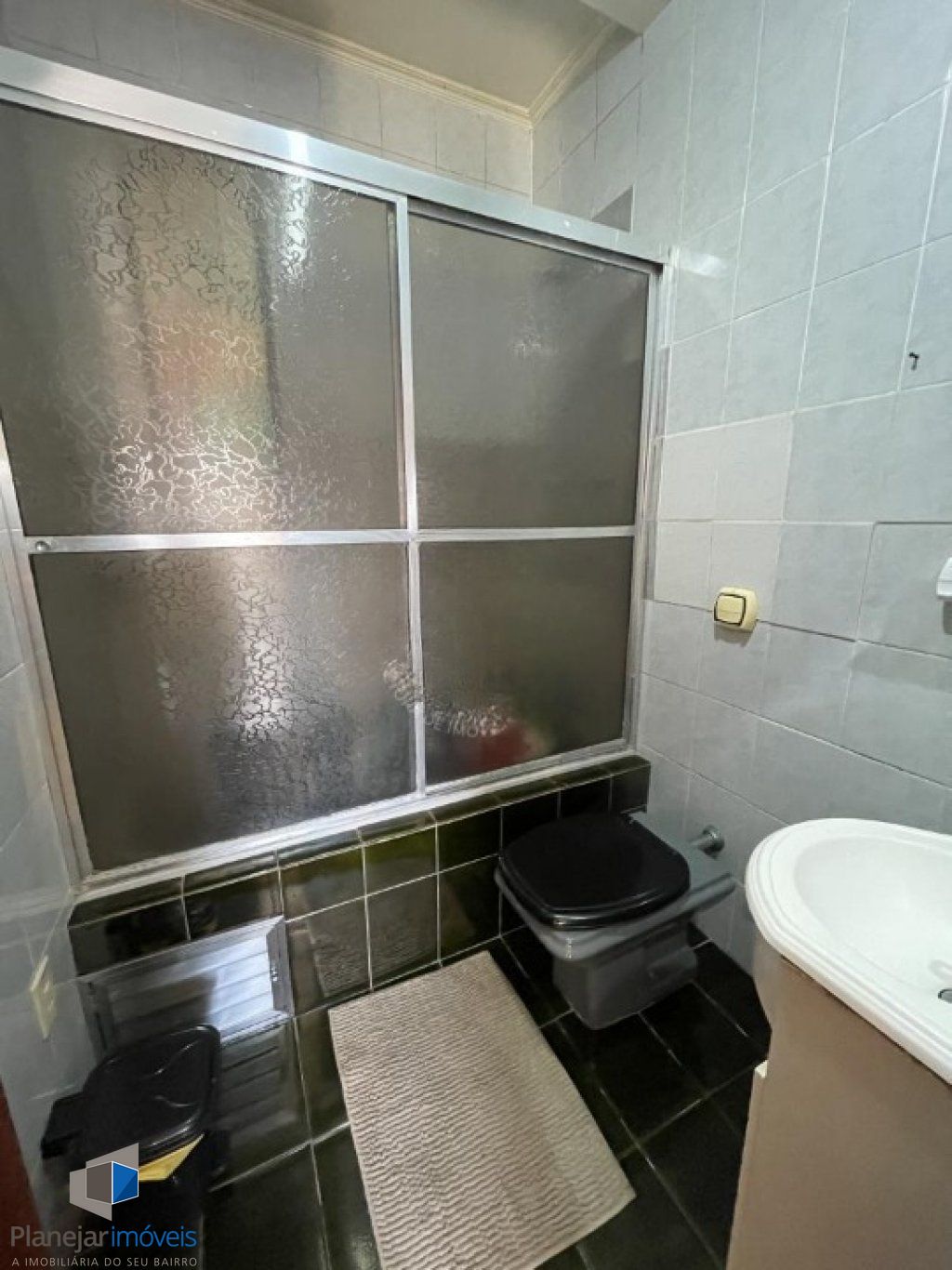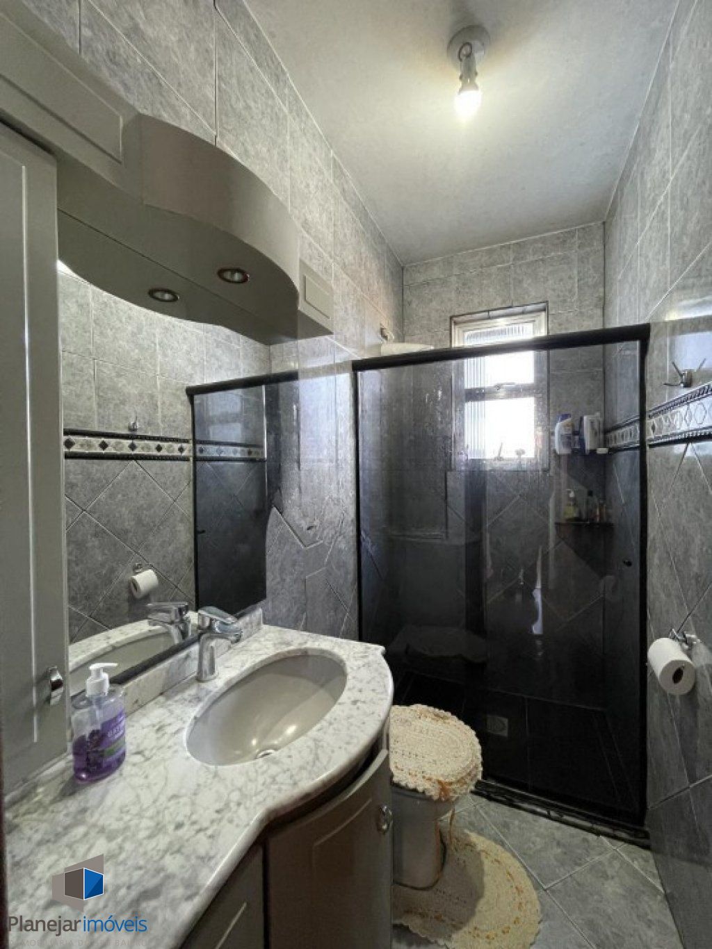 Banheiro principal totalmente revestido em cerâmica, com box de vidro, armários planejados e janela com abertura para o exterior.