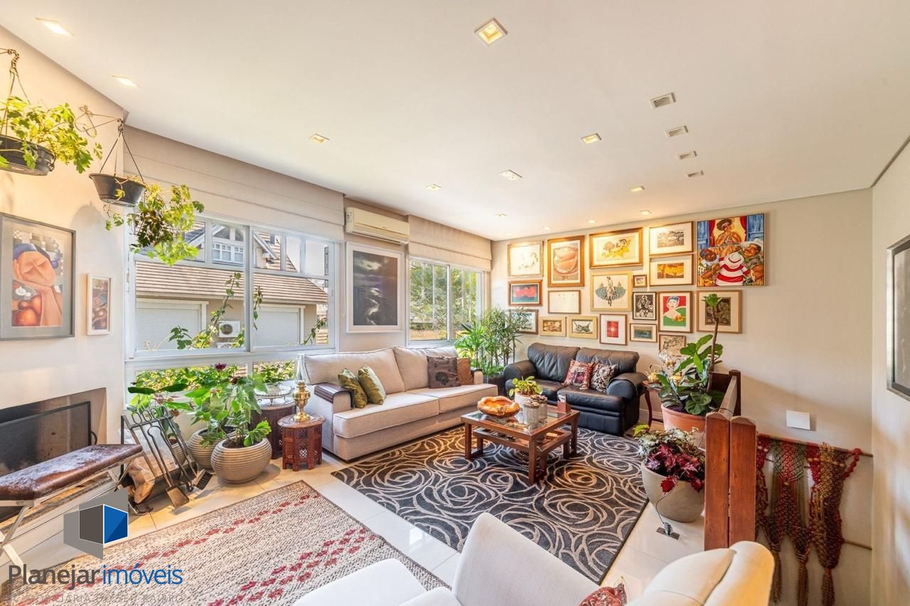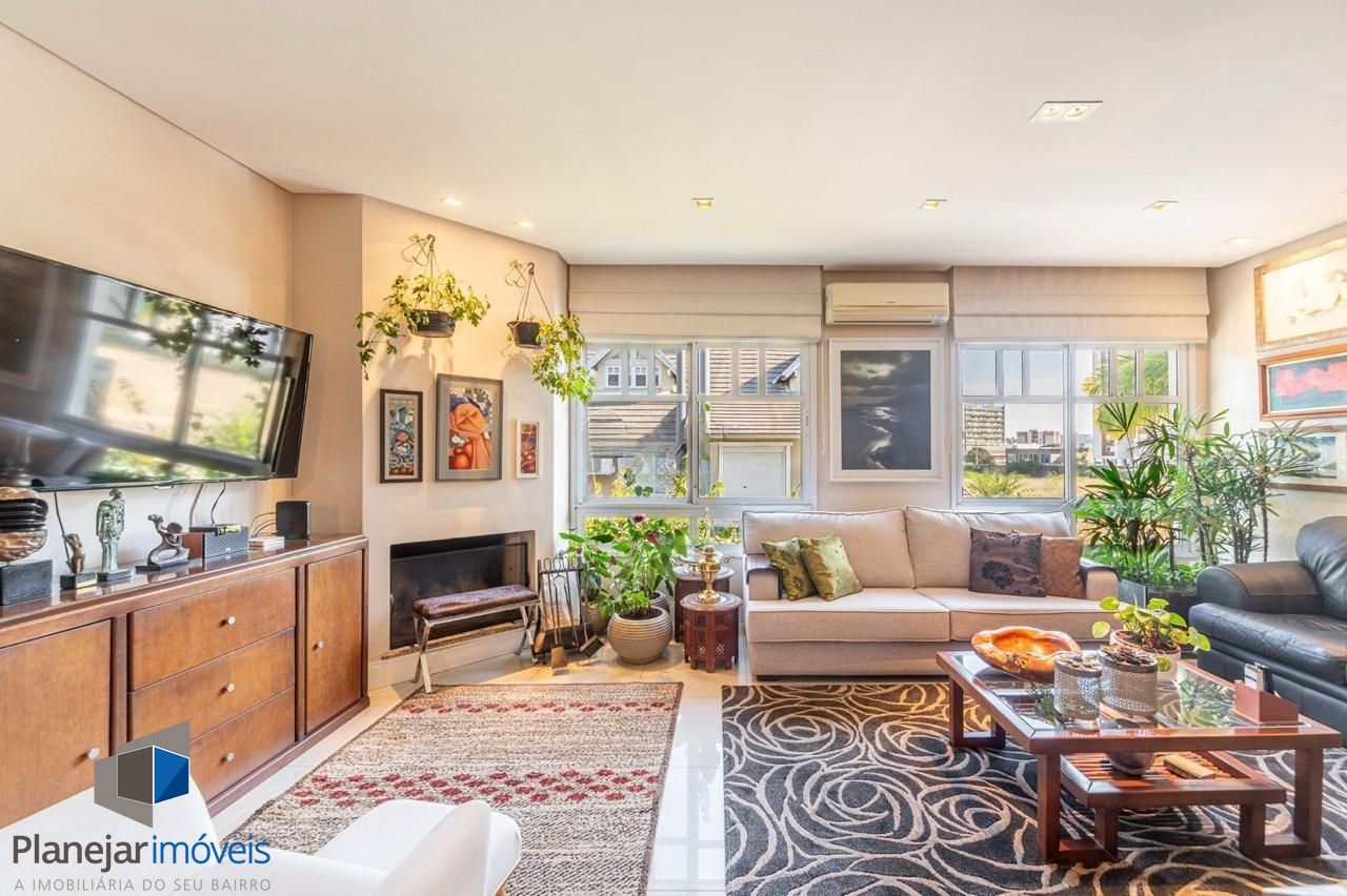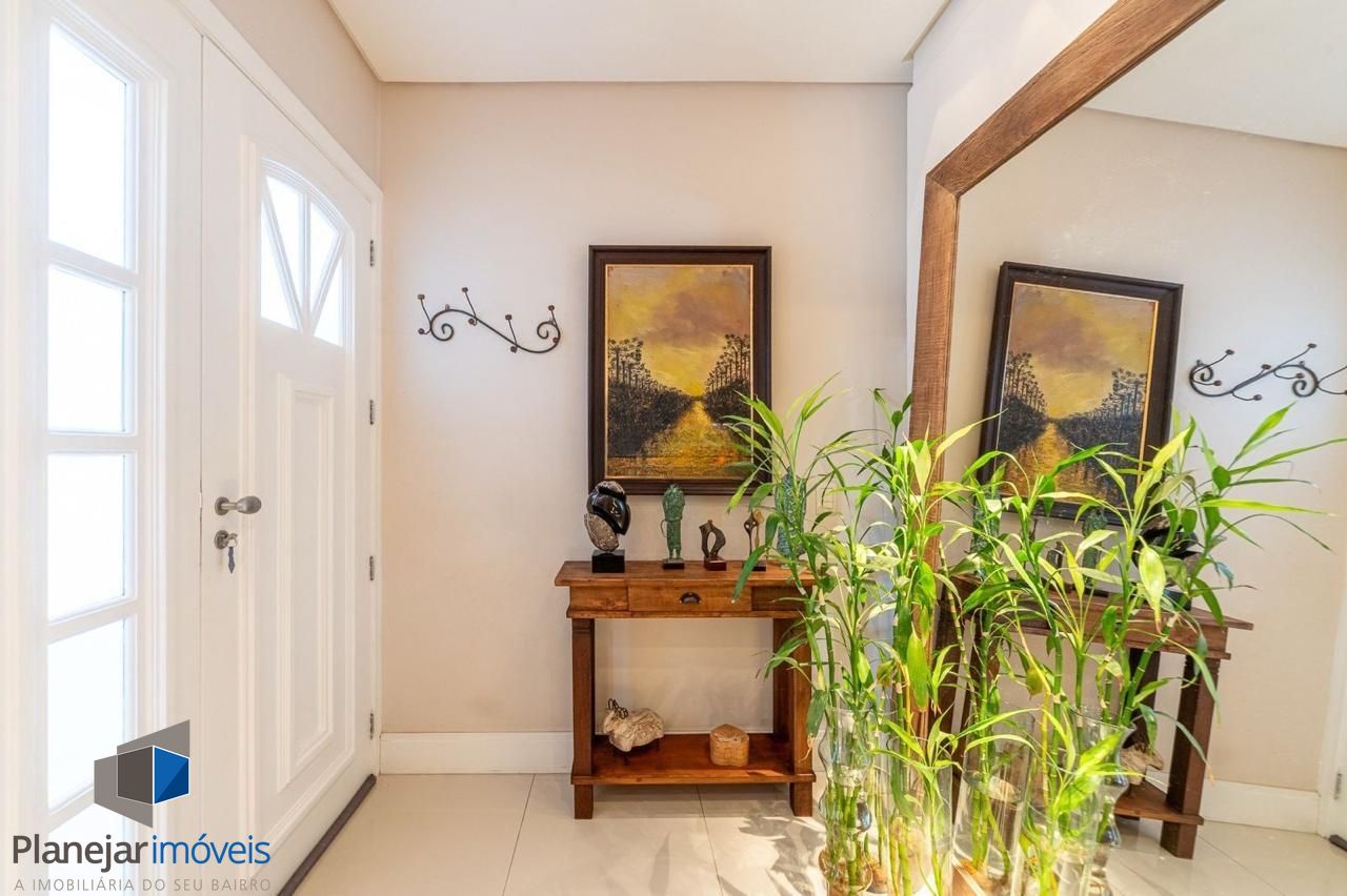 No pavimento térreo há um elegante hall de entrada, lavabo, living amplo com dois ambientes (sala de estar com lareira e sala de jantar), cozinha planejada, área de serviço fechada e área externa aberta. A casa conta com espaço previsto para a instalação de elevador.