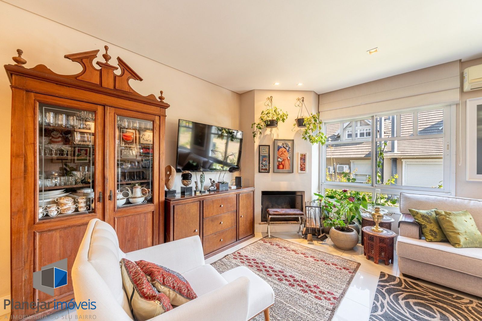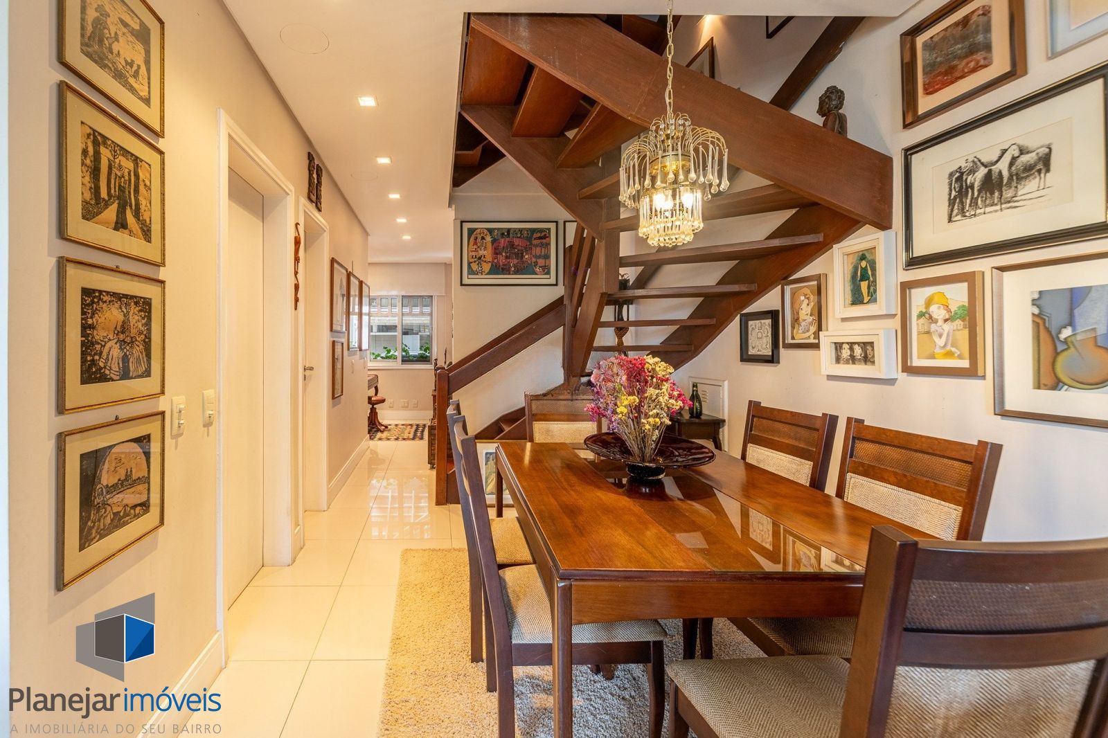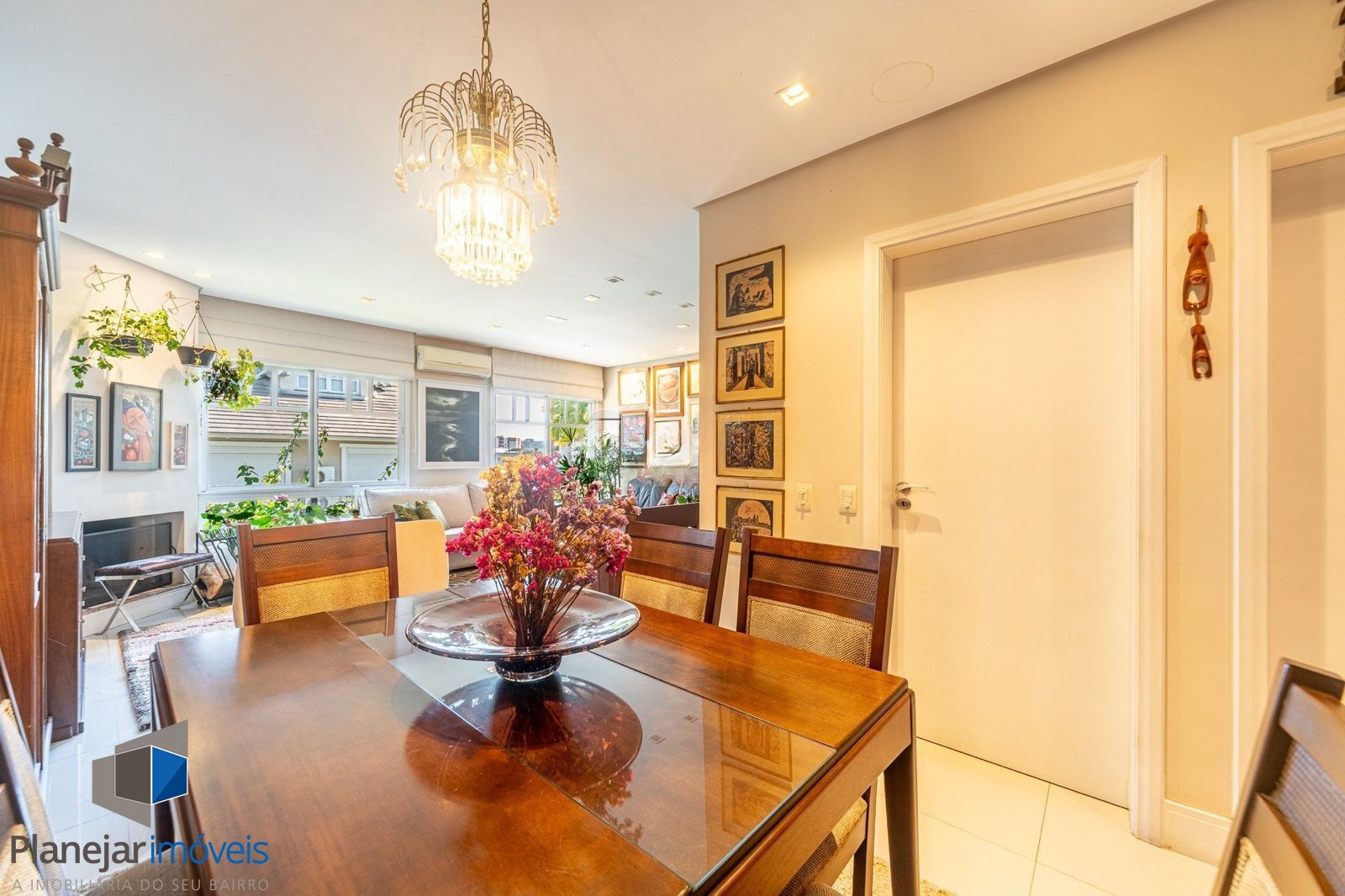 No pavimento térreo há um elegante hall de entrada, lavabo, living amplo com dois ambientes (sala de estar com lareira e sala de jantar), cozinha planejada, área de serviço fechada e área externa aberta. A casa conta com espaço previsto para a instalação de elevador.