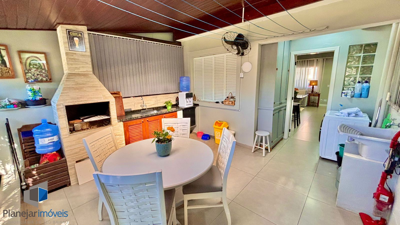 Nos fundos, um espaço fechado e confortável está integrado à casa, oferecendo uma churrasqueira e espaço para confraternizações. Esta área é uma verdadeira extensão da sala, proporcionando uma experiência única de lazer em casa e ampliando o espaço útil.