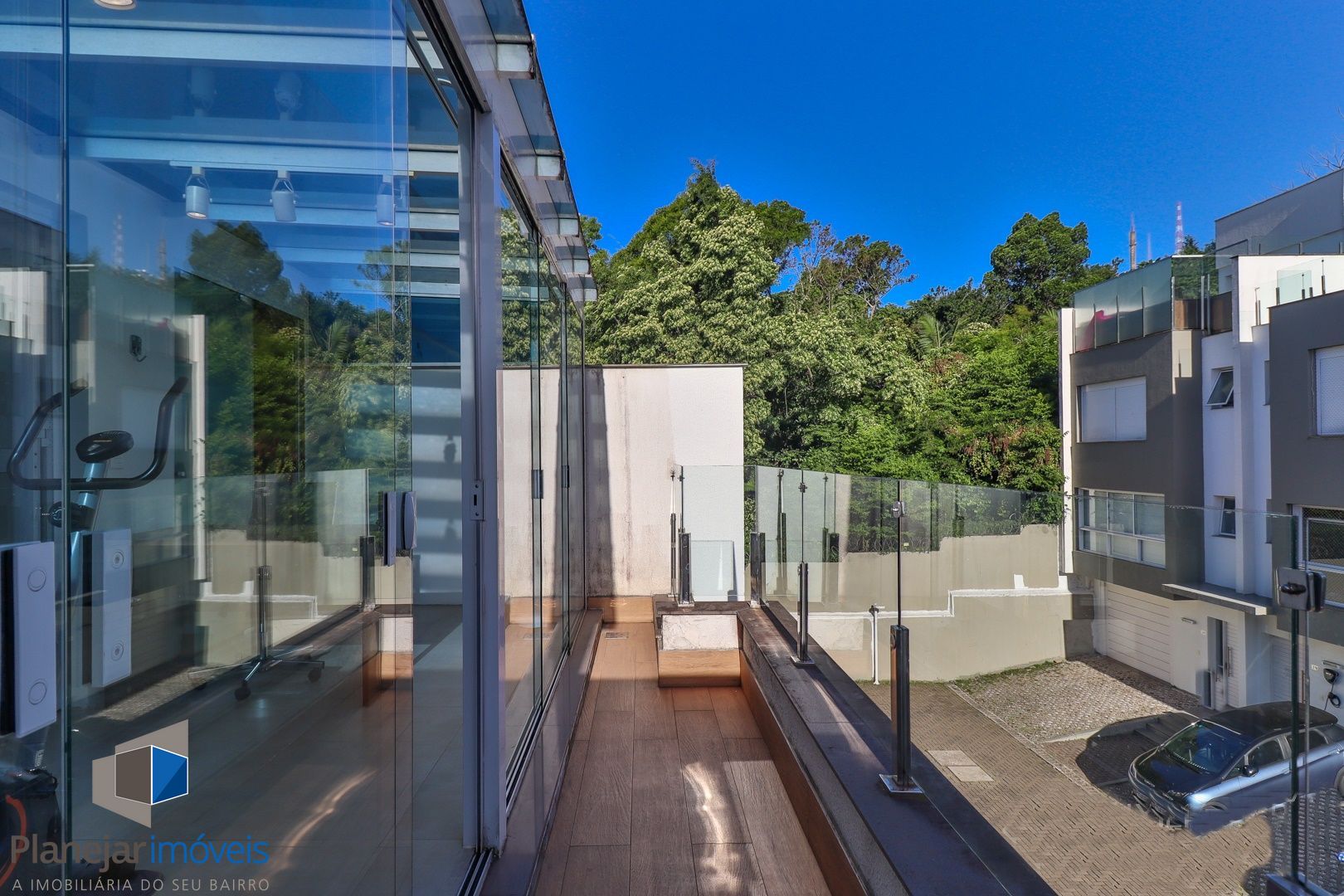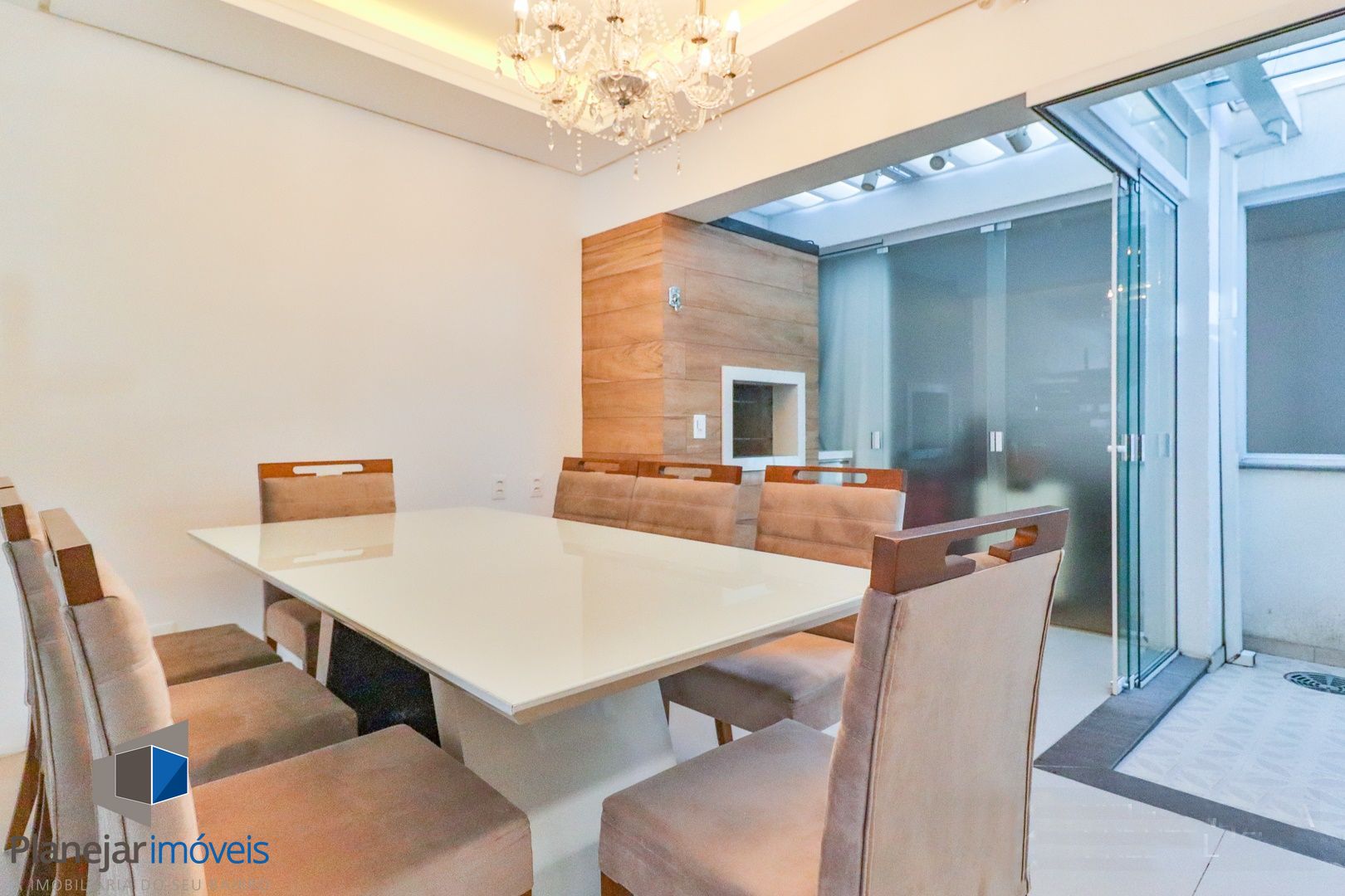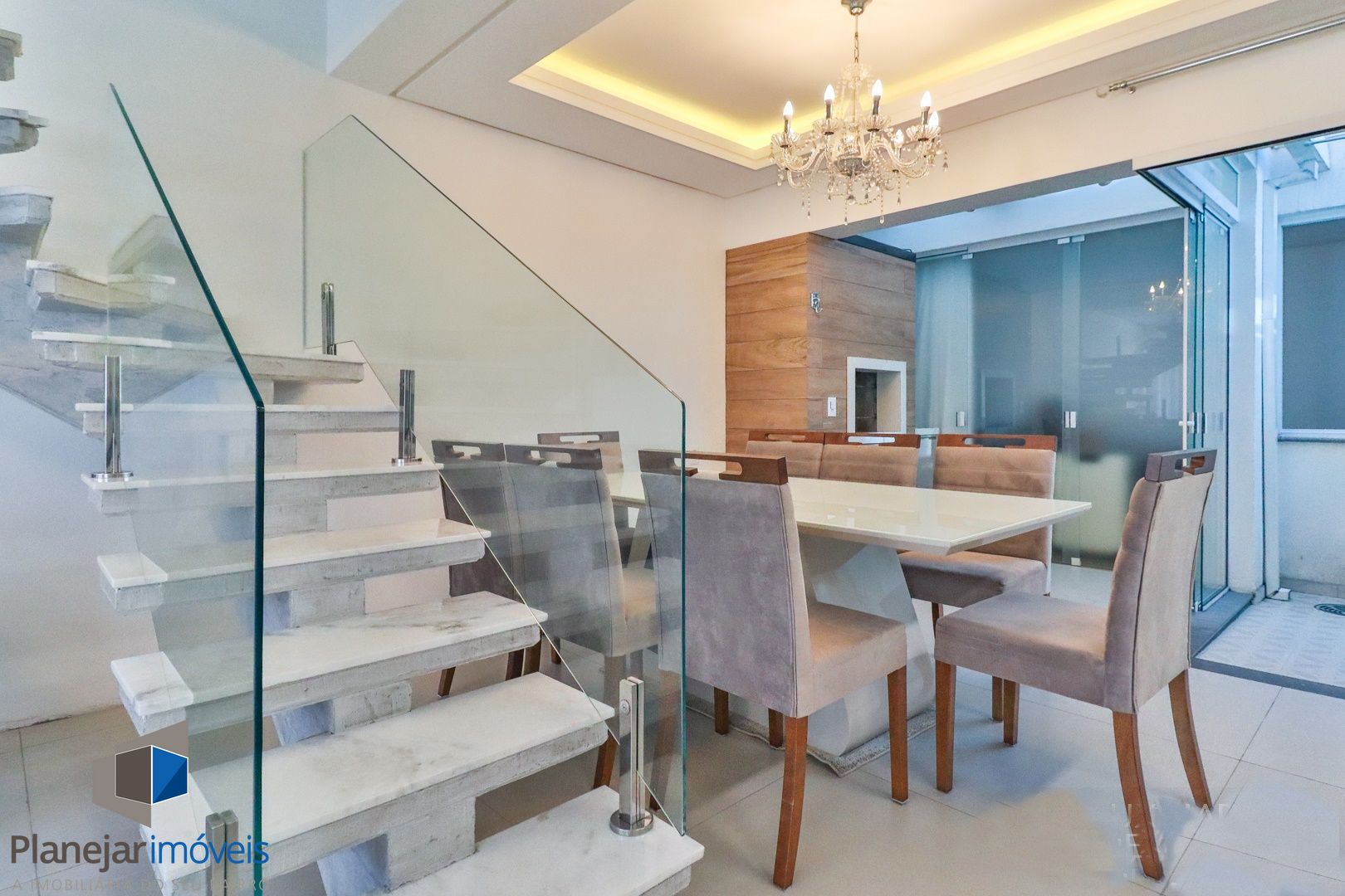 Primeiro pavimento conta com sala de estar, jantar, churrasqueira, lavabo, cozinha, área de serviço com telhado retrátil transparente e a suíte.