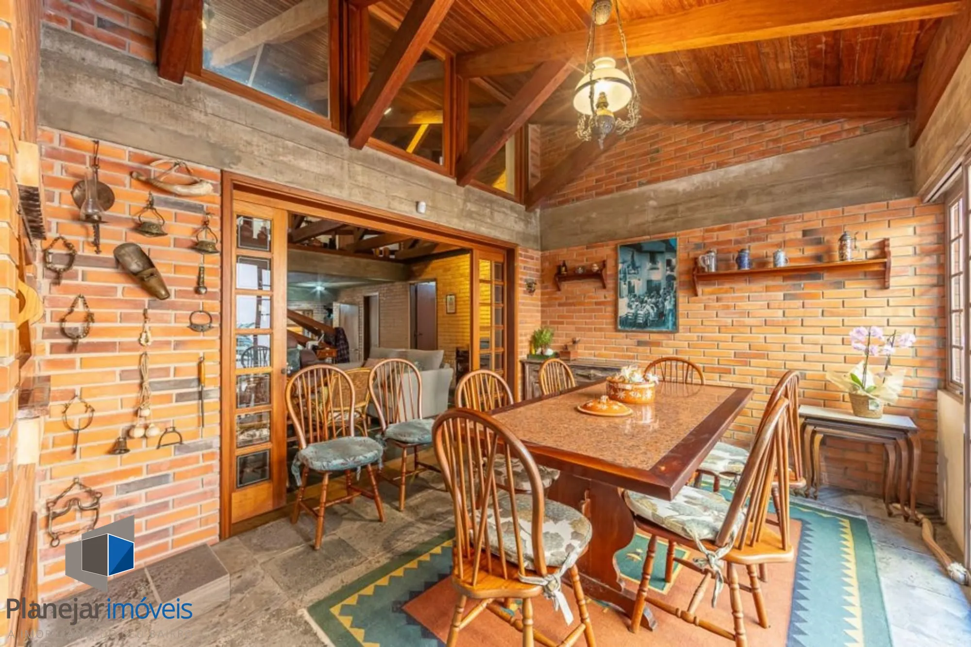 No andar térreo, o imóvel conta com garagem para duas vagas cobertas e um hall de entrada imponente com excelente iluminação natural. Possui duas salas (estar e jantar), sendo uma delas com lareira. A sala de jantar integra-se harmoniosamente ao espaço gourmet com churrasqueira e ao charmoso jardim de inverno, conectando-se à área externa, que dispõe de pátio privativo, espaço gourmet externo e piscina aquecida por sistema de energia solar. A cozinha possui copa funcional, acompanhada de dependência de empregada completa e ampla área de serviço.